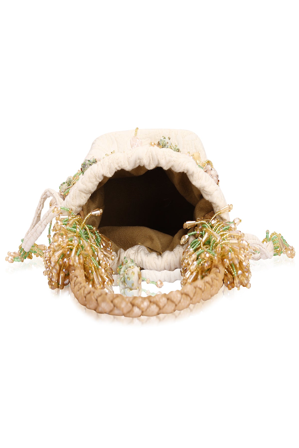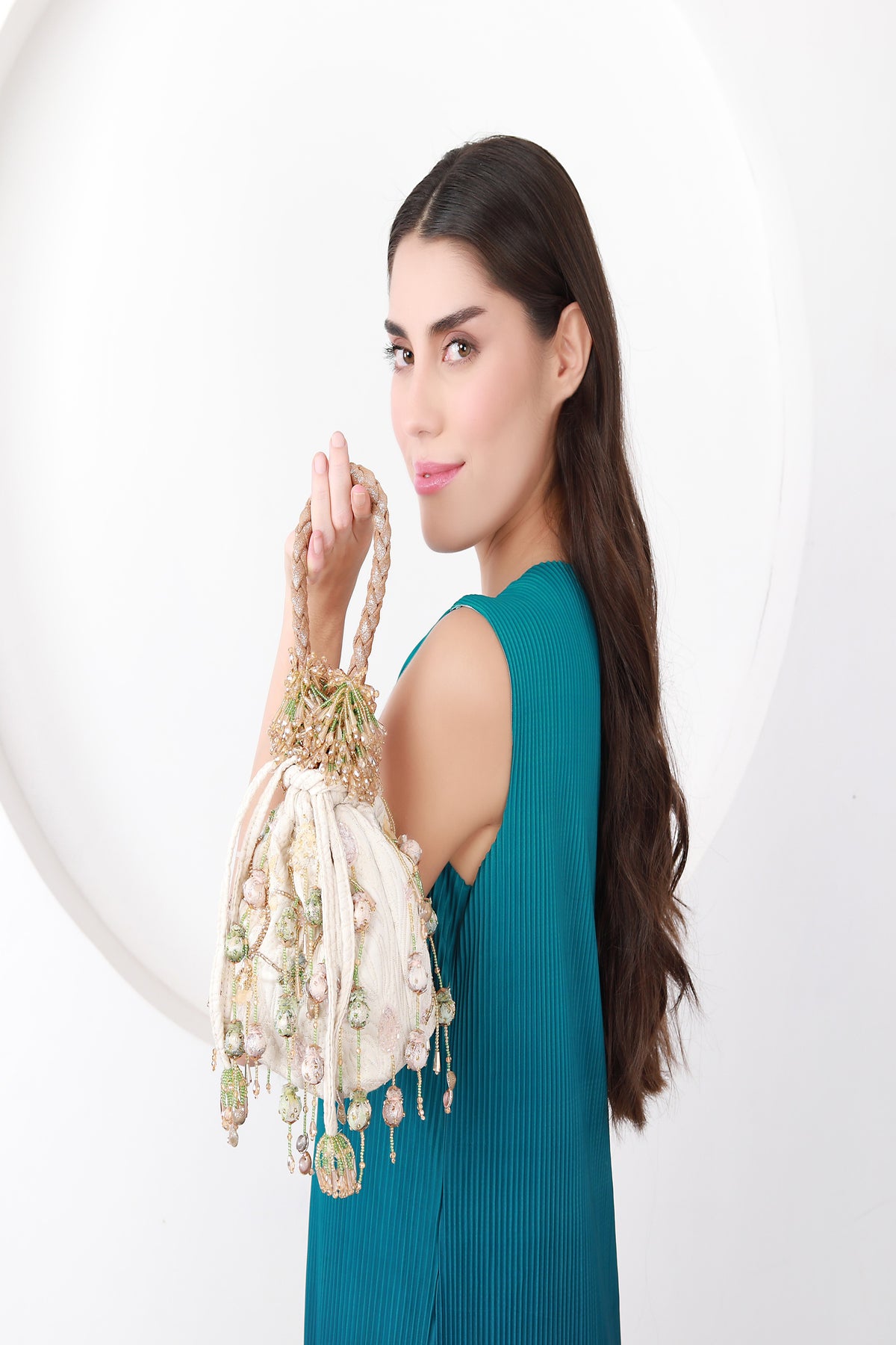 This silk jacquard fabric adds a touch of opulence, while the shell tassels infuse a hint of whimsy. Each patchwork detail is meticulously handcrafted, adorned with delicate beads and katdana for an artisanal touch. Embrace elegance with our unique potli, blending traditional craftsmanship with contemporary style.