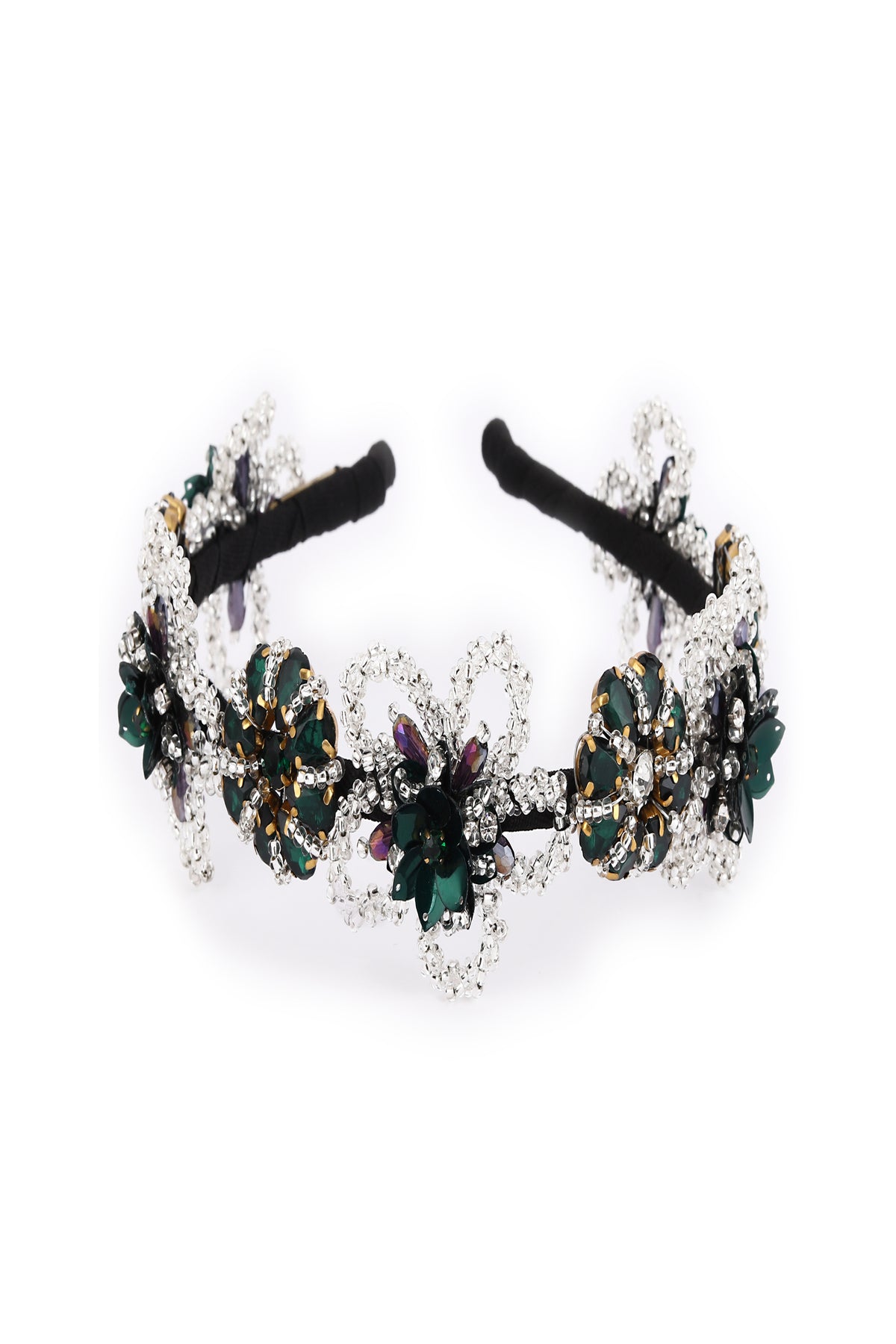 Add a regal touch to your hairstyle with the Emerald Cascade hair accessory—a luxurious silver-toned statement piece designed to captivate. This ornate hairband features an intricate cascading floral motif adorned with deep emerald green crystals and sparkling clear rhinestones. At its center lies a bold emerald green crystal, surrounded by shimmering accents and delicate silver filigree scrollwork. The tiered design gracefully transitions from petite florals at the top to larger, bloom-like elements at the base, creating a dynamic, flowing silhouette. Handcrafted with exquisite attention to detail, this hair accessory is perfect for bridal wear, festive occasions, or evening events. A must-have for those seeking elegance with a pop of rich color.