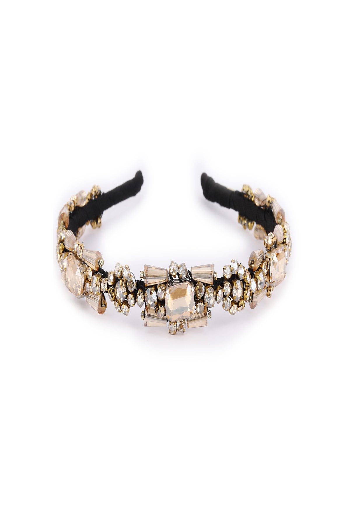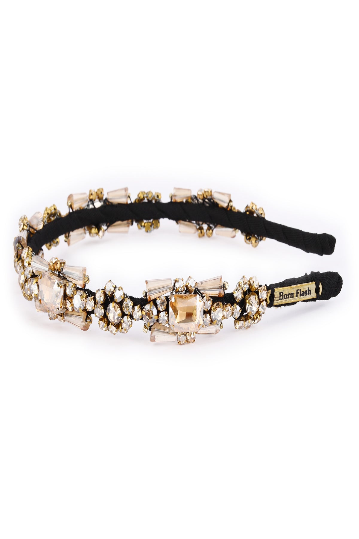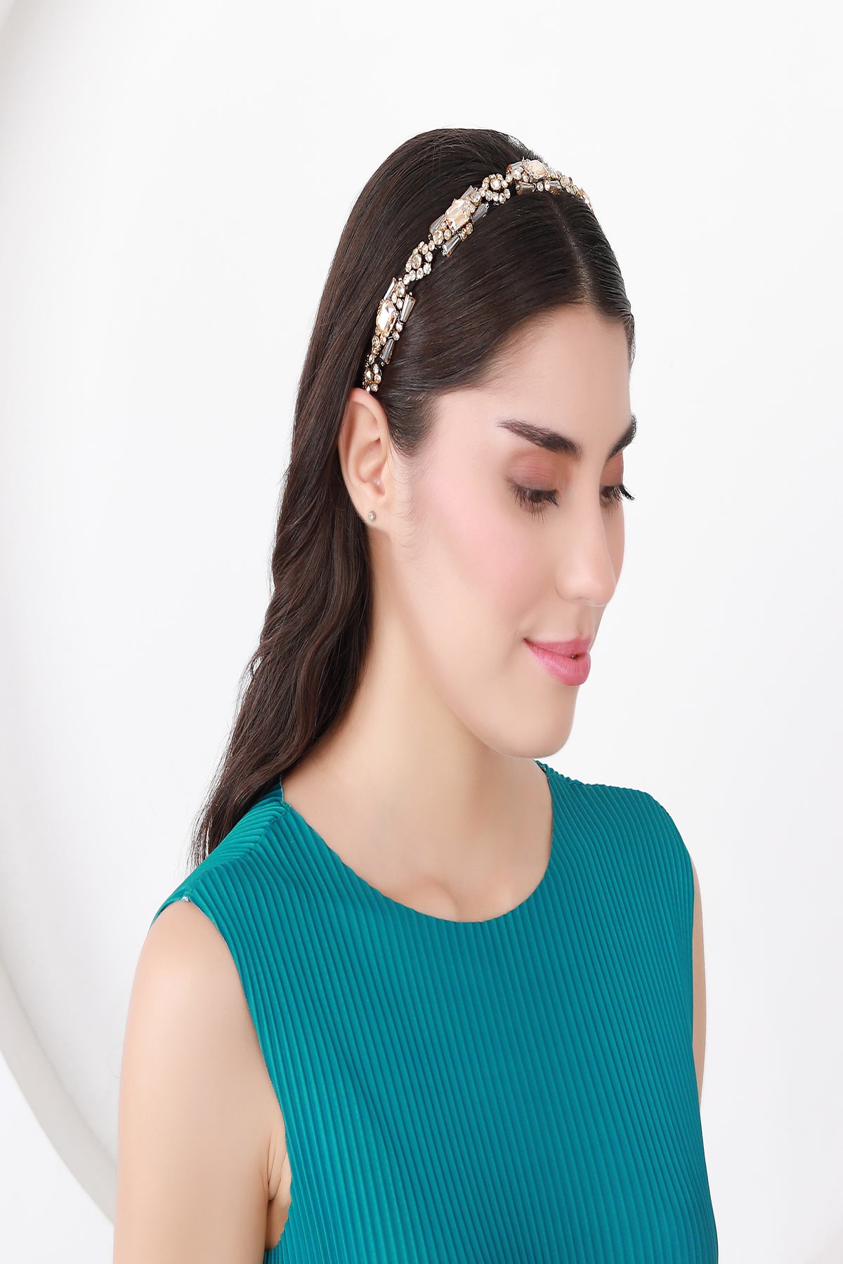 Elevate your look with this luxurious Crystal Bloom Headband, designed to add instant elegance and sparkle. Featuring a central rectangular champagne crystal surrounded by intricate gold-toned floral metalwork and shimmering clear rhinestones, this headband radiates opulence. Graduated crystal accents flow outward, transitioning seamlessly from bold centerpieces to delicate beadwork. This accessory is perfect for weddings, evening events, or adding a touch of glamour to your everyday style.