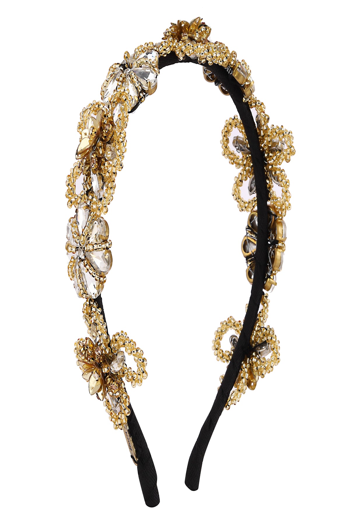 Add a touch of timeless elegance with the Golden Bloom gold-toned crystal hairband—a handcrafted masterpiece inspired by vintage floral motifs. This open-ended hairband features intricate filigree detailing and exquisite flower-shaped designs, each adorned with sparkling clear rhinestone crystals. The teardrop and floral-cut stones are set in finely detailed gold-toned metalwork, showcasing delicate granulated accents that reflect expert craftsmanship. The bracelet catches and reflects light beautifully, making it the perfect accessory for weddings, festive occasions, or bridal wear. Lightweight yet luxurious, this hairband sits gracefully on the head, offering both comfort and standout style. A must-have for lovers of classic, feminine jewelry.