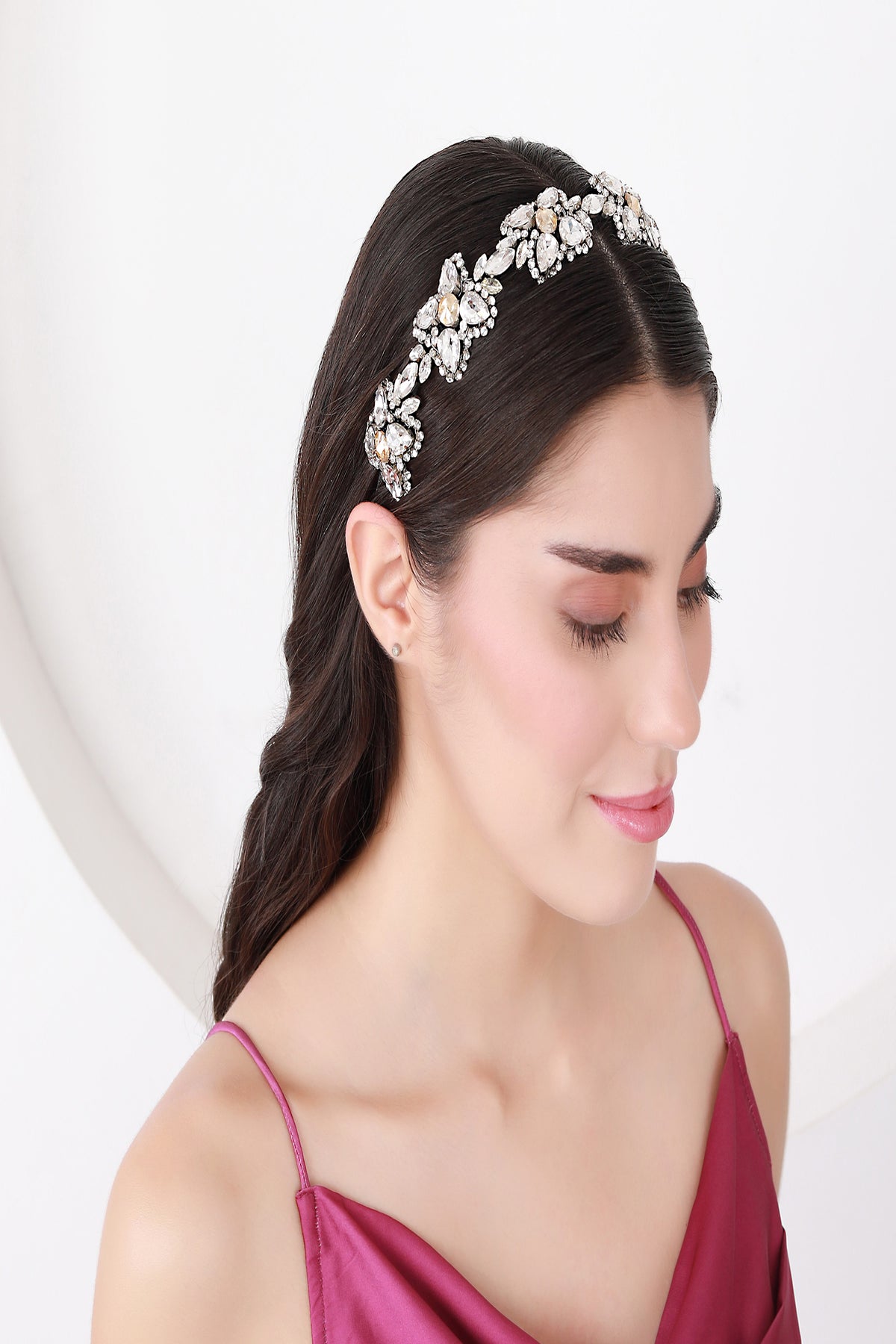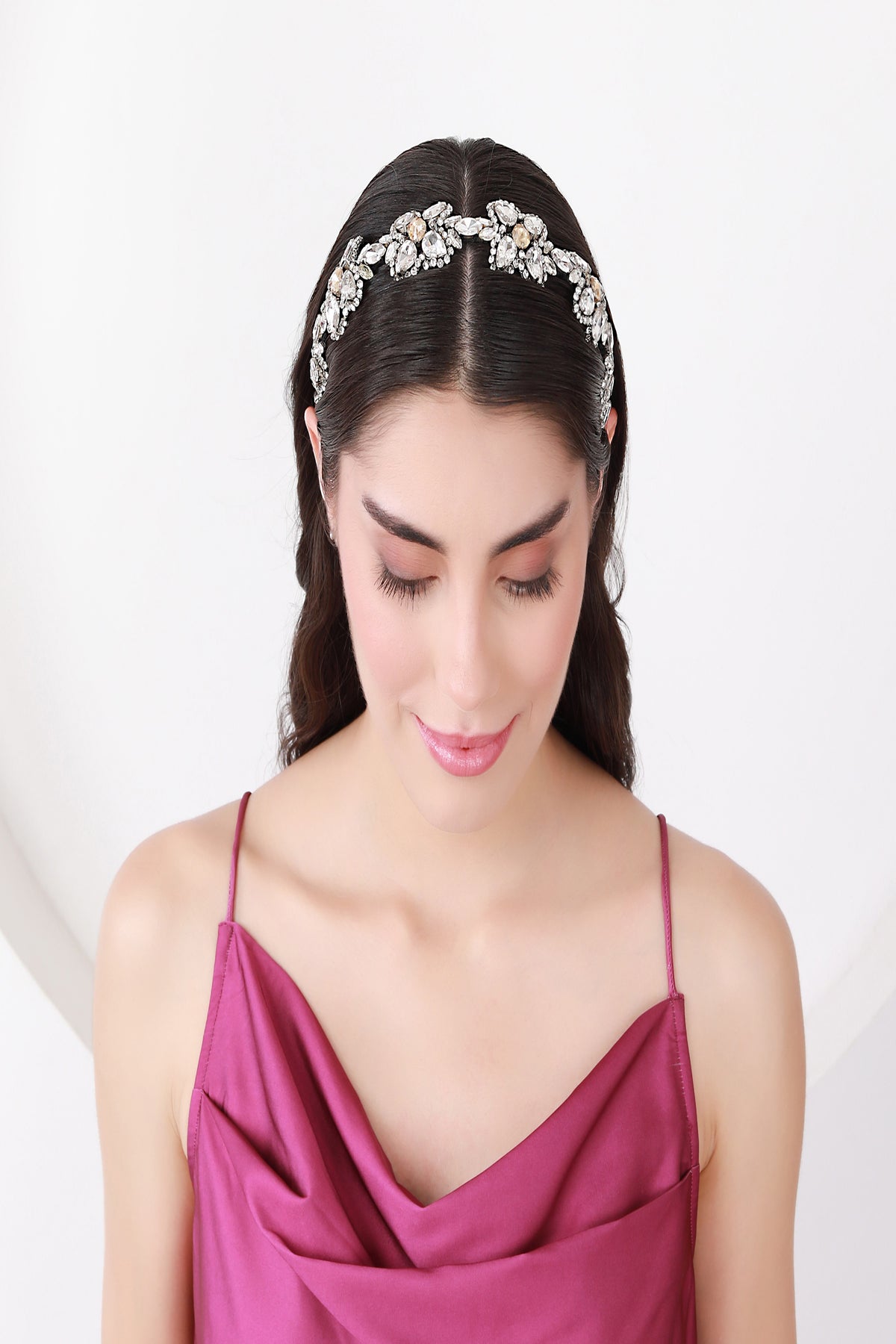 Make a bold statement with the Midnight Petals hairband—a show-stopping accessory designed to captivate with its floral-inspired brilliance. This ornate headpiece features a dramatic arrangement of large marquise-cut clear crystals. Smaller round crystals form elegant halos around the larger stones, adding depth and luminosity to the design. Set against a contrasting dark metal base, the sparkling gemstones offer a striking balance of vintage charm and modern glamour. Perfect for bridal wear, evening events, or festive occasions, this handcrafted crystal hairband ensures all eyes stay on you. Ideal for women seeking elegant, standout accessories that pair effortlessly with both traditional and contemporary outfits.