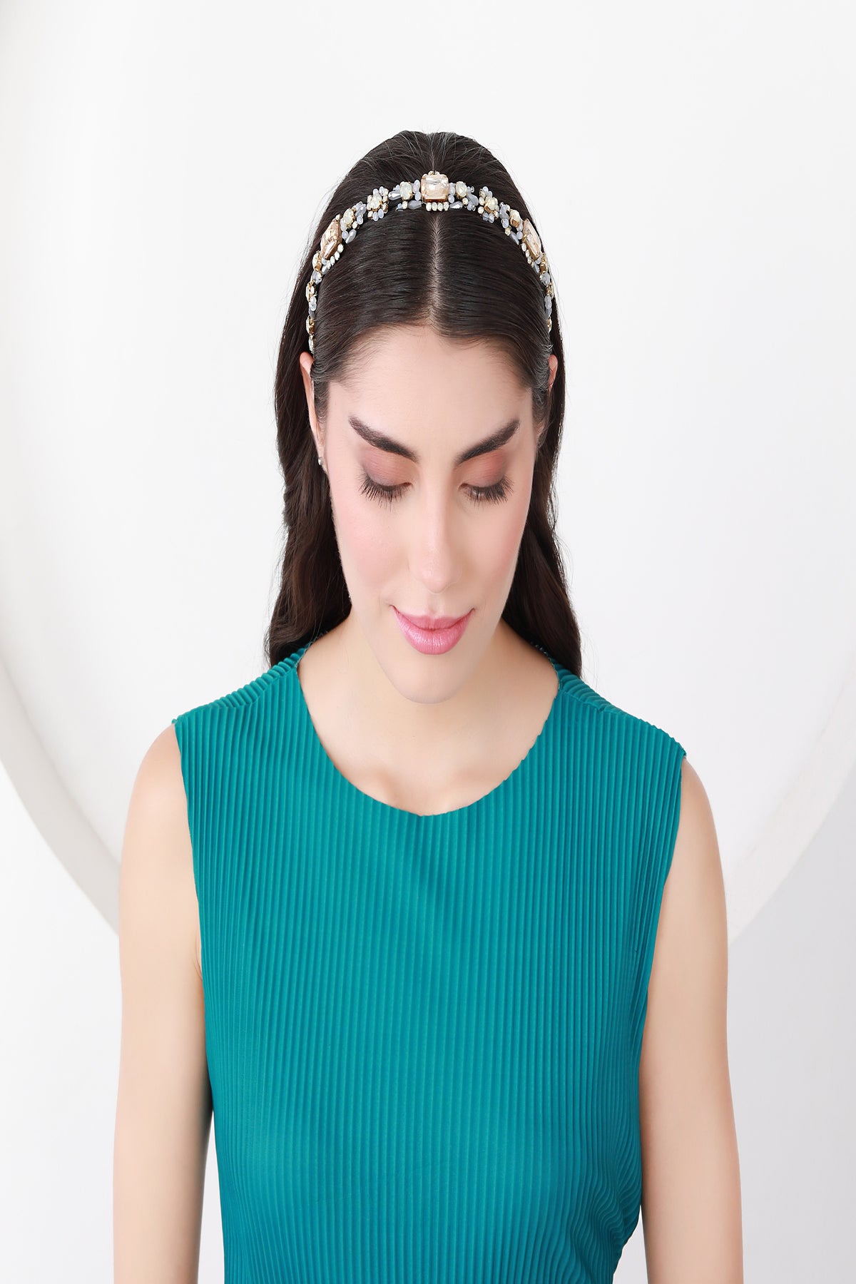 Ornate Shine – Crystal Pearl Headband with Gold Accents