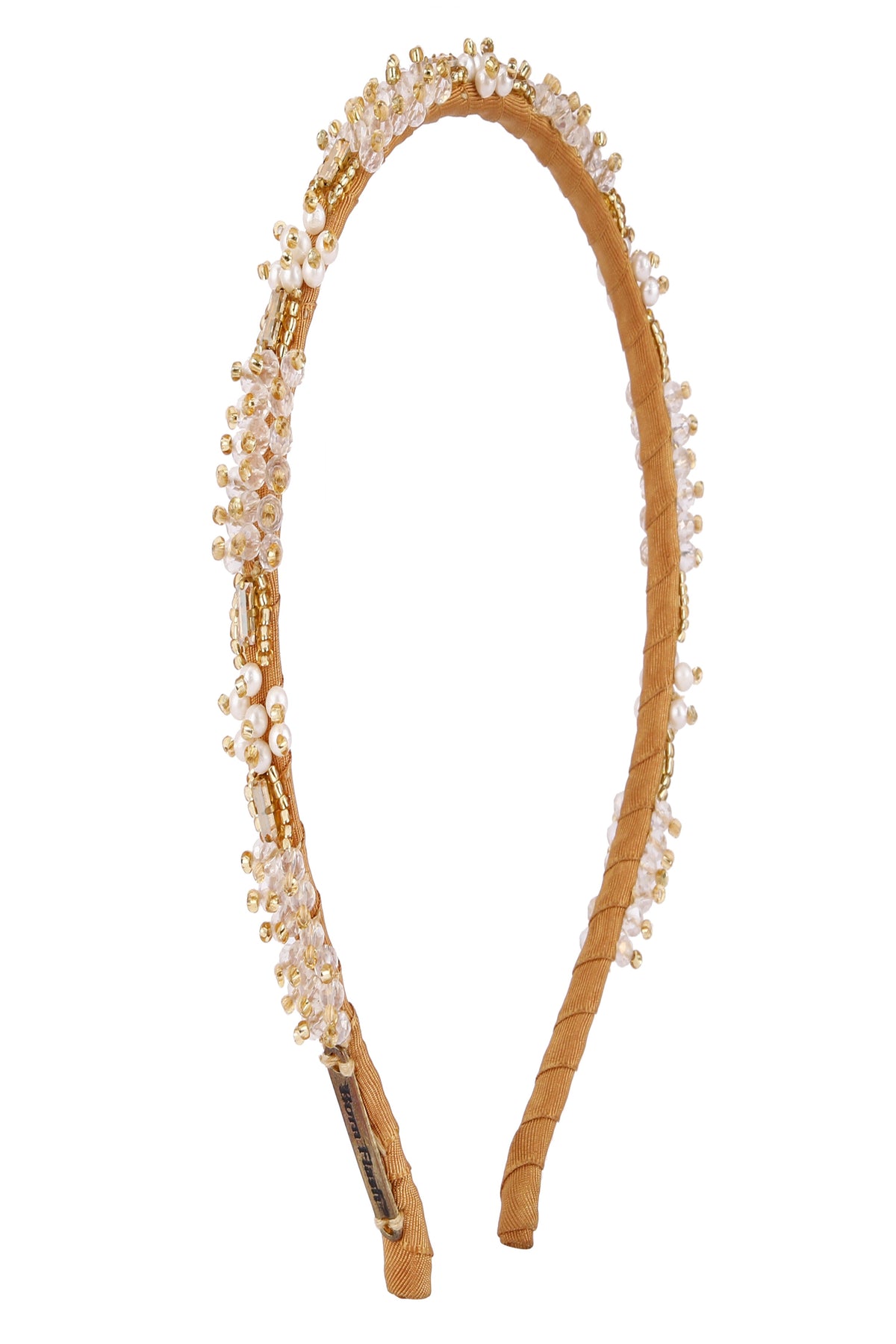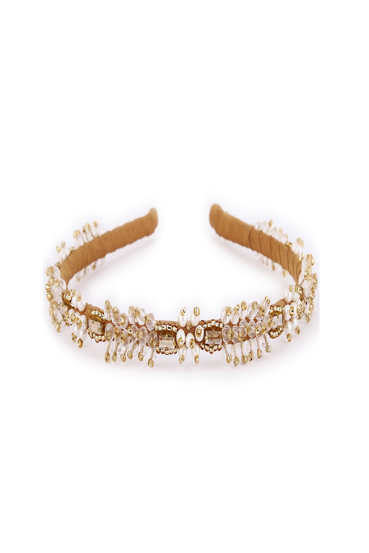 Add a touch of timeless elegance with the Pearl Bloom gold-toned crystal hairband—a handcrafted piece that radiates femininity and grace. This delicate hairband showcases a floral-inspired design, adorned with clusters of shimmering clear crystals and soft white pearl-like beads. The intricate gold-toned metalwork enhances the vintage charm, featuring ornate accents that frame each floral cluster with refined detail. Perfect for weddings, festive occasions, or everyday sophistication, this hairband complements both traditional and modern outfits. Lightweight and comfortable, it's a versatile accessory that brings a graceful sparkle. Ideal as a gift for bridesmaids, loved ones, or yourself.