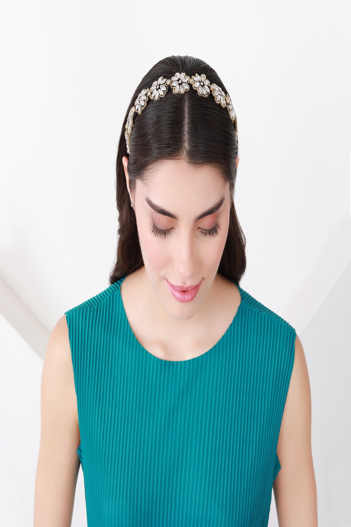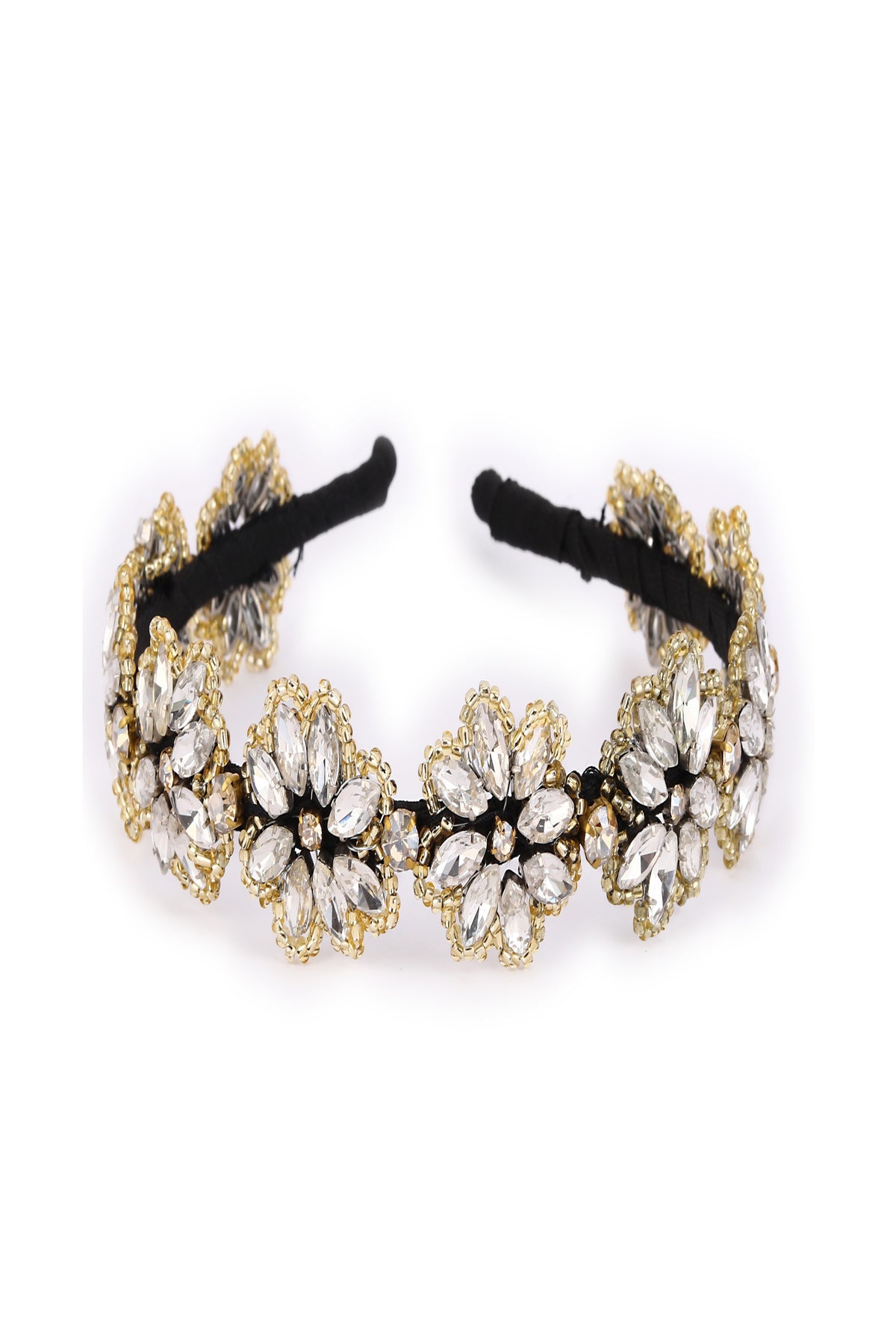 Elevate your style with this luxurious gold-toned crystal headband featuring a stunning floral design. Crafted with clear marquise-cut crystals set in gold-toned metal, each flower cluster shines with elegance and brilliance. The crystals are connected by delicate gold chains, forming a repeating motif that adds vintage charm and refined glamour. This headpiece is perfect for weddings, bridal wear, festivals, or formal occasions.