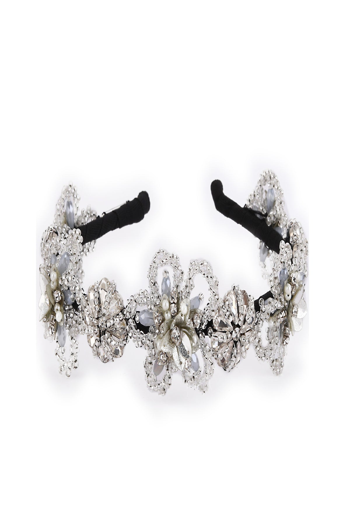Introducing the Silver Whimsy hair accessory—a dazzling statement piece designed to elevate any bridal or festive hairstyle. This handcrafted, filigree-style hairband features an intricate floral motif with delicately curved silver petals, swirling vine-like patterns, and layered dimensional elements. Embellished with shimmering clear crystals and soft blue gemstones, the design captures a perfect balance of elegance and sparkle. This ornate piece adds a touch of sophistication to updos, buns, or flowing hair. Ideal for weddings, receptions, sangeet nights, or evening events, this lightweight and secure accessory is a must-have for special occasions.