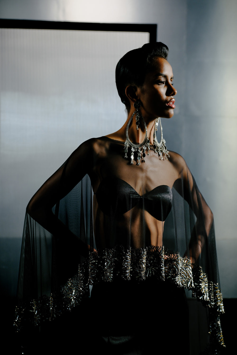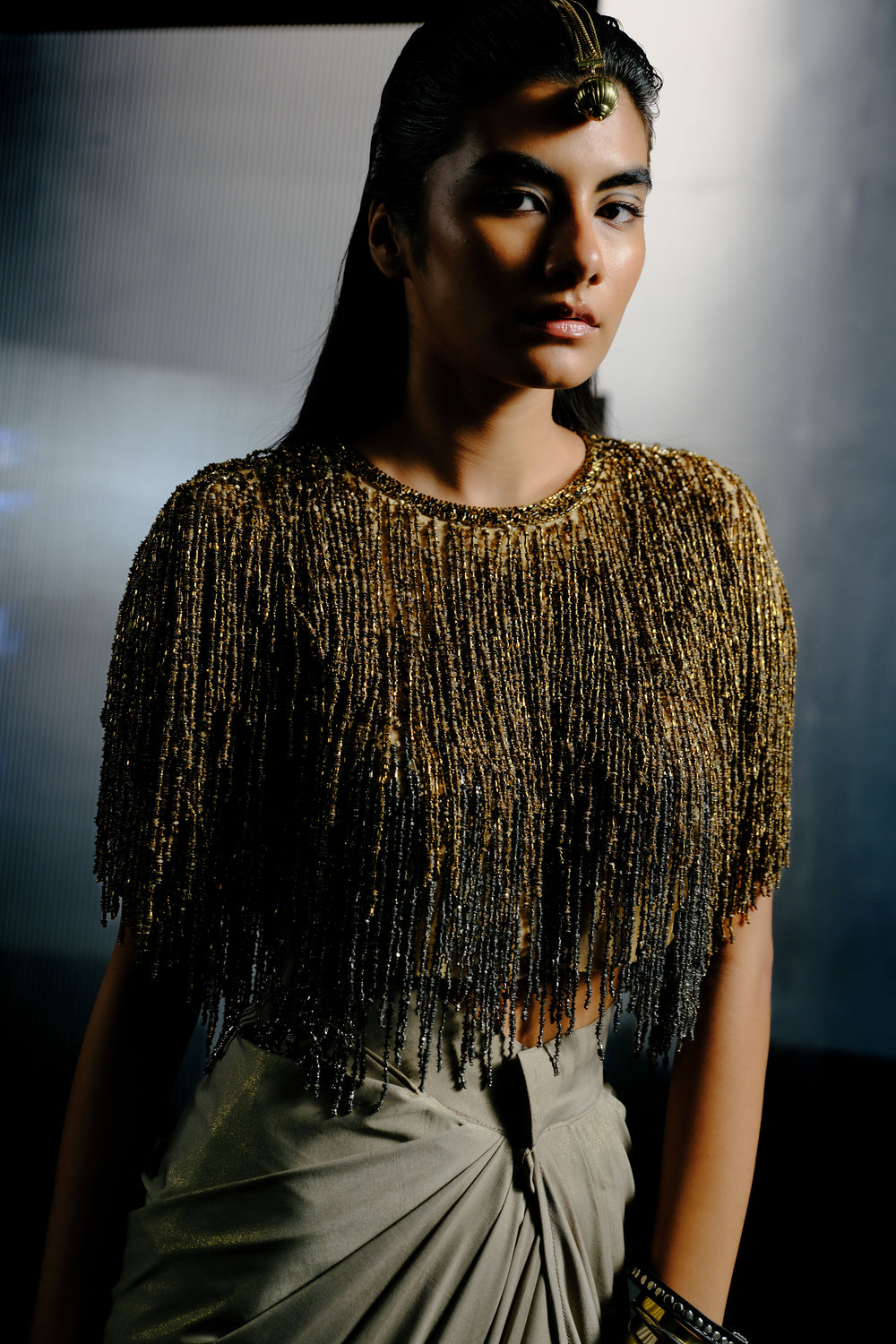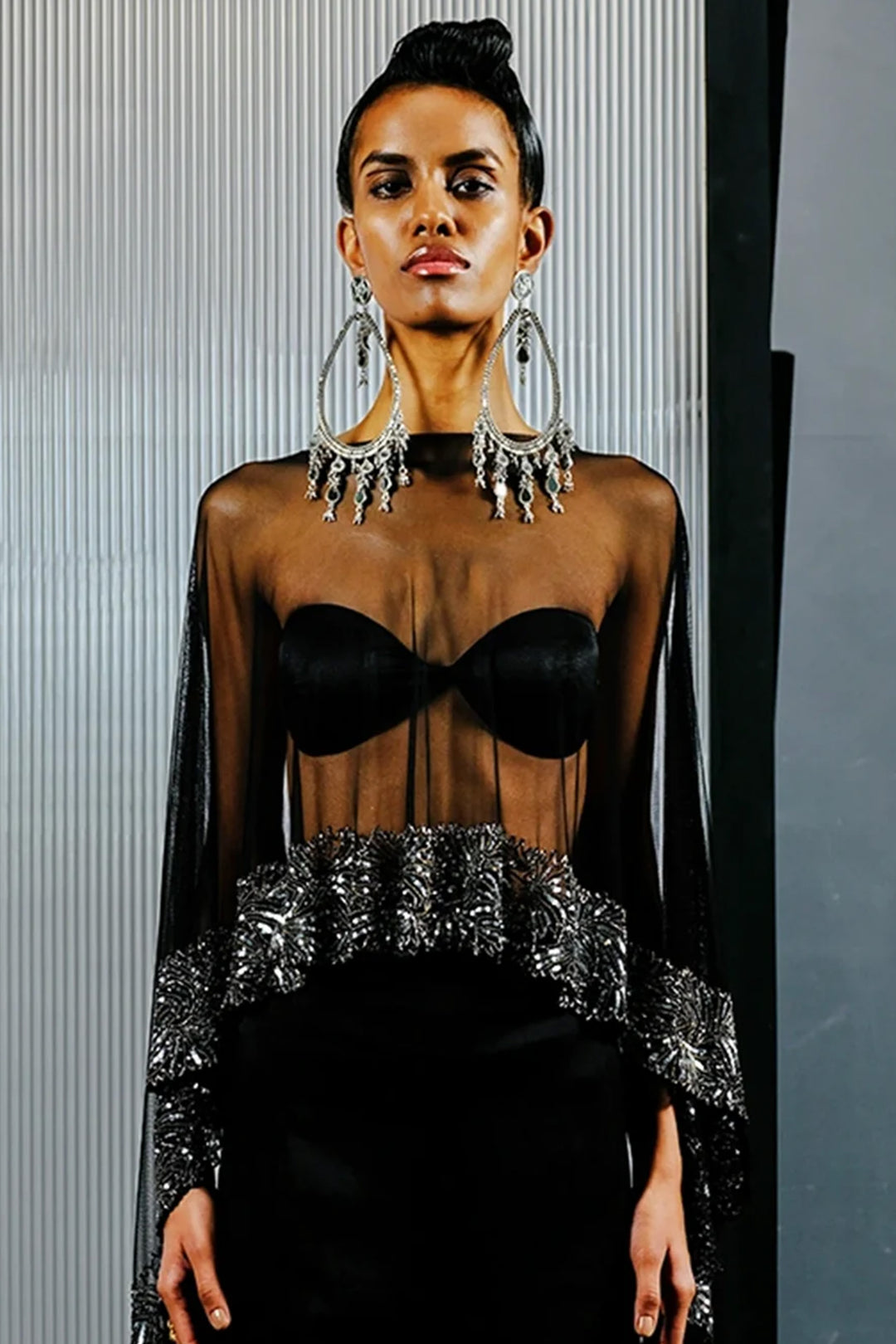 Black-Silver Bugle Bead & Sequin Chain Cape