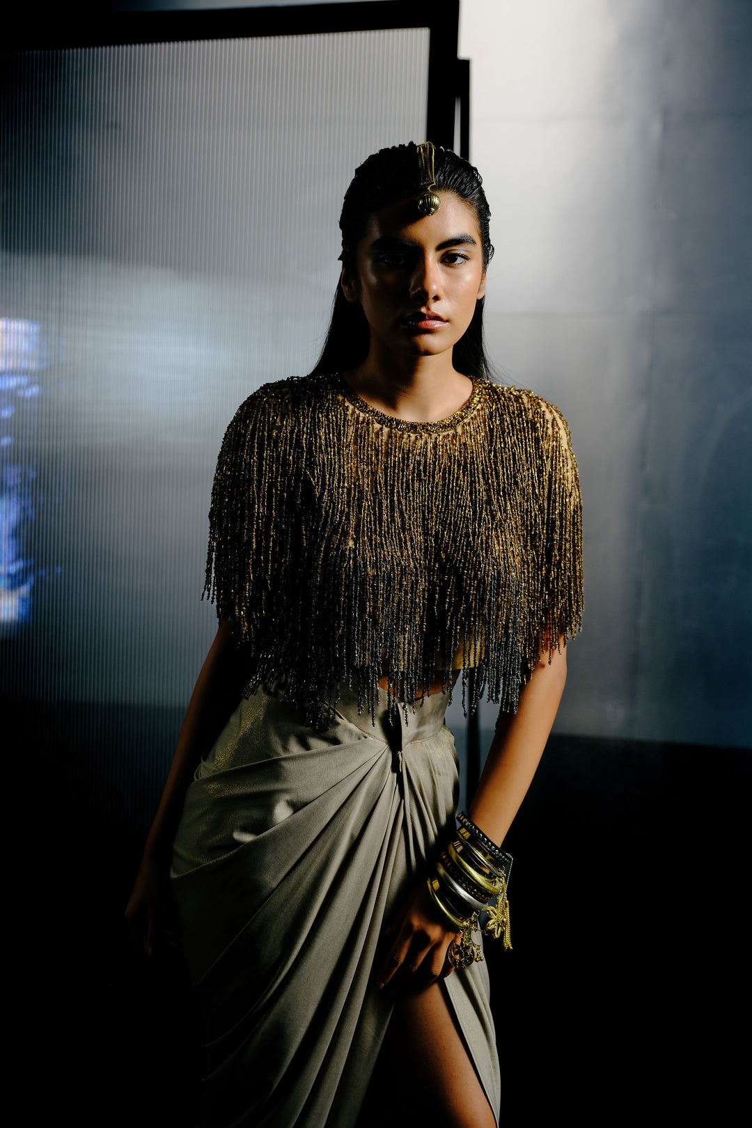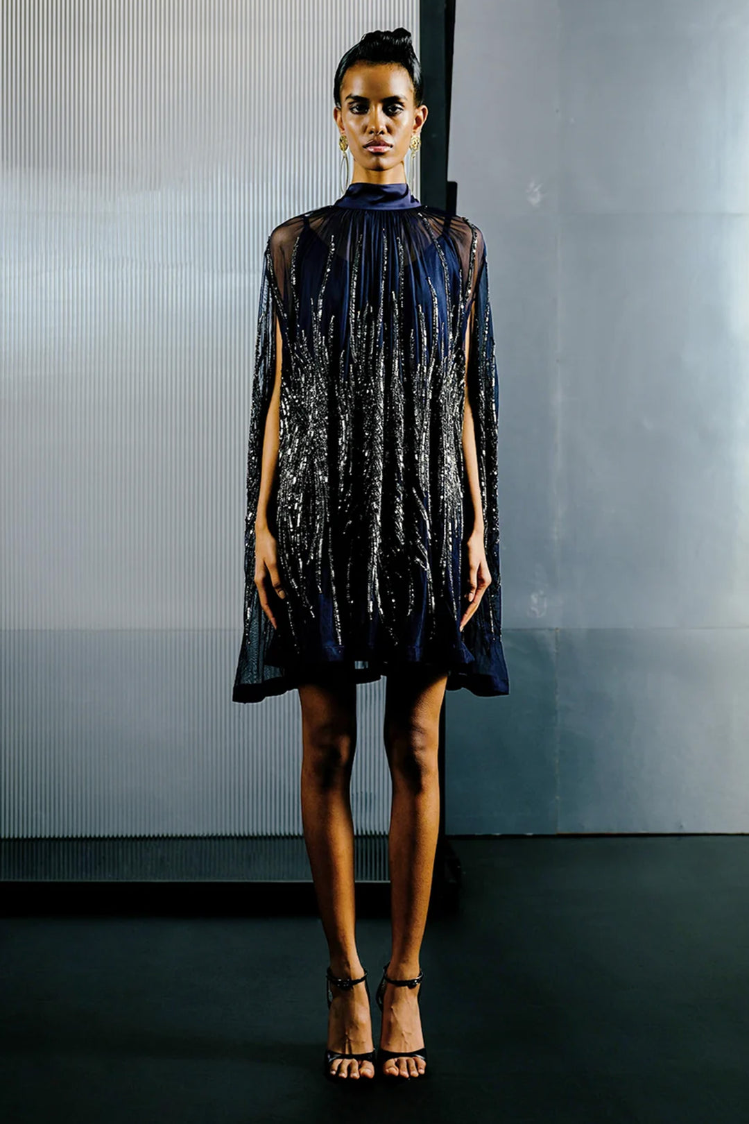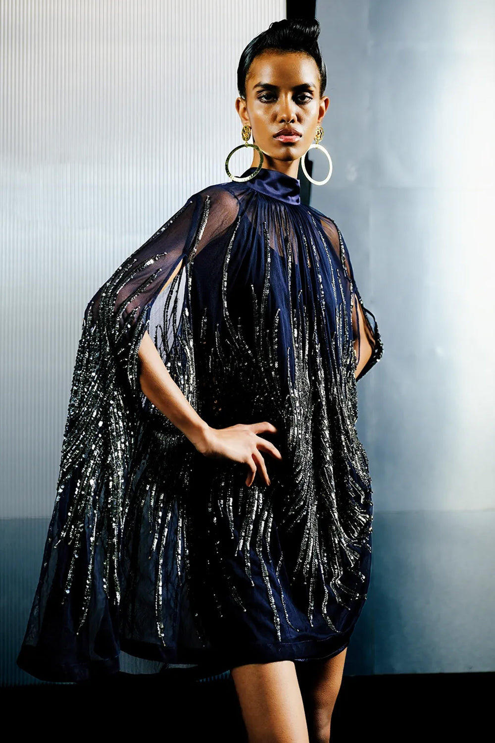 Black-Silver Bugle Bead & Sequin Chain Cape