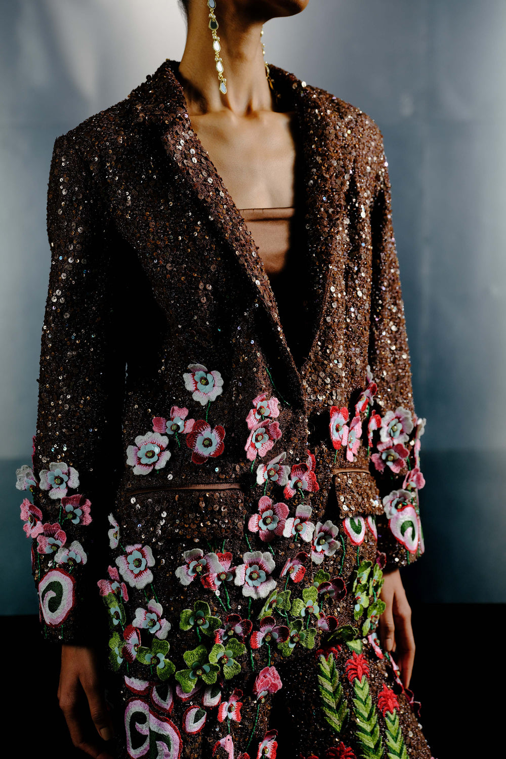 Brown Net Jacket in Multi-Tone Embellishments