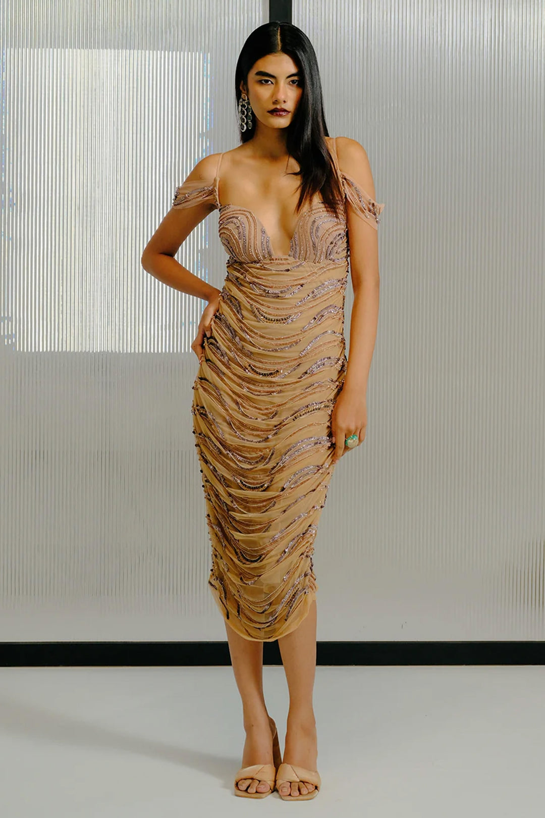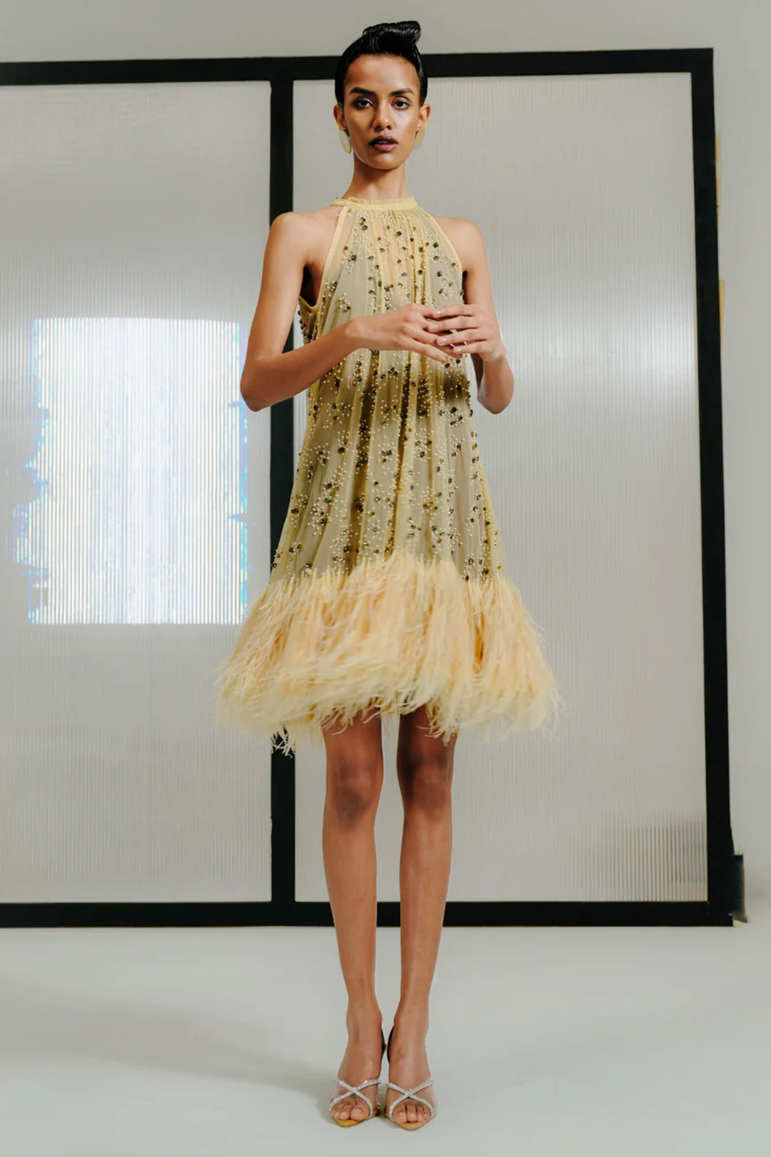 Nude Feather-Crystal Embellished Short Shift Dress