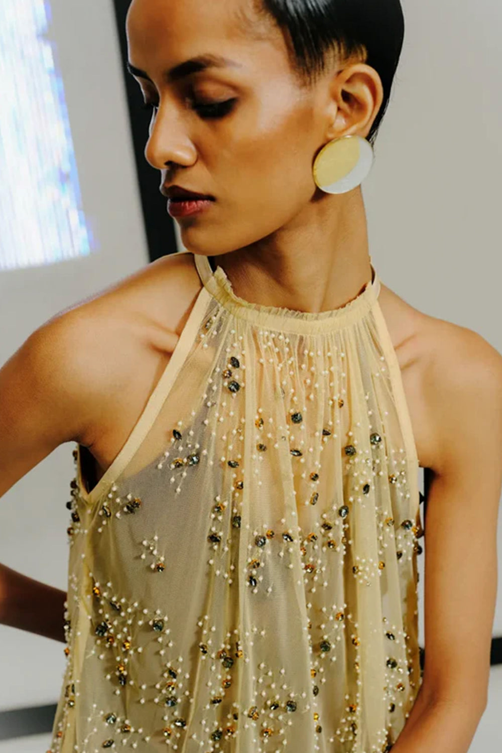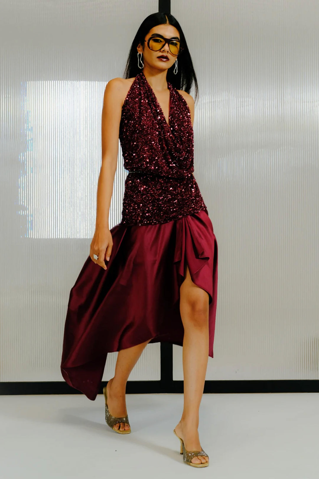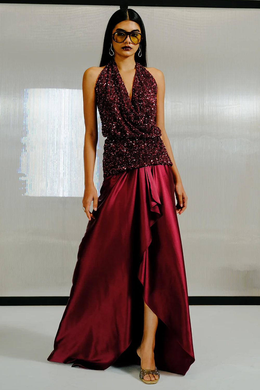 Plum Net Sequin-Bugle Bead Embroidered Halter Top