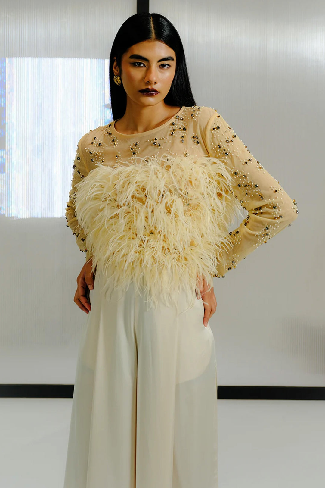 Nude Feather & Crystal Embellished Top
