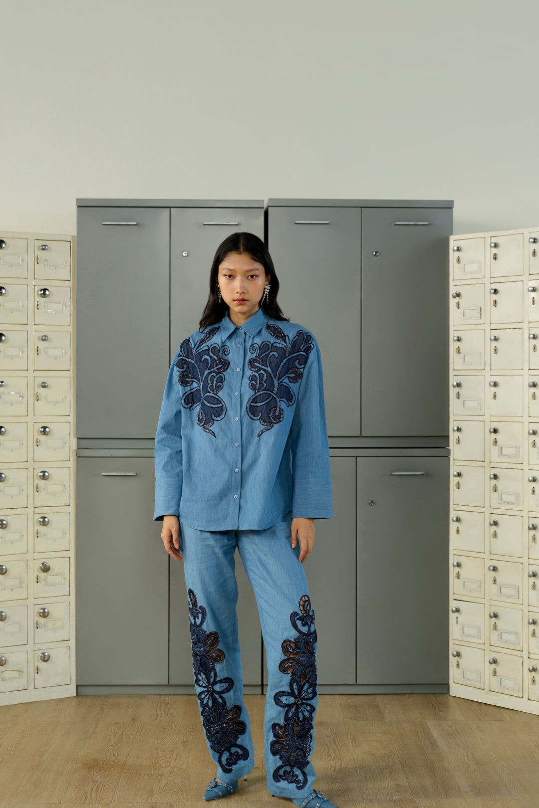 A Chanderi silk shirt and bell pants, paired with a hand-embroidered bib - Ivory
