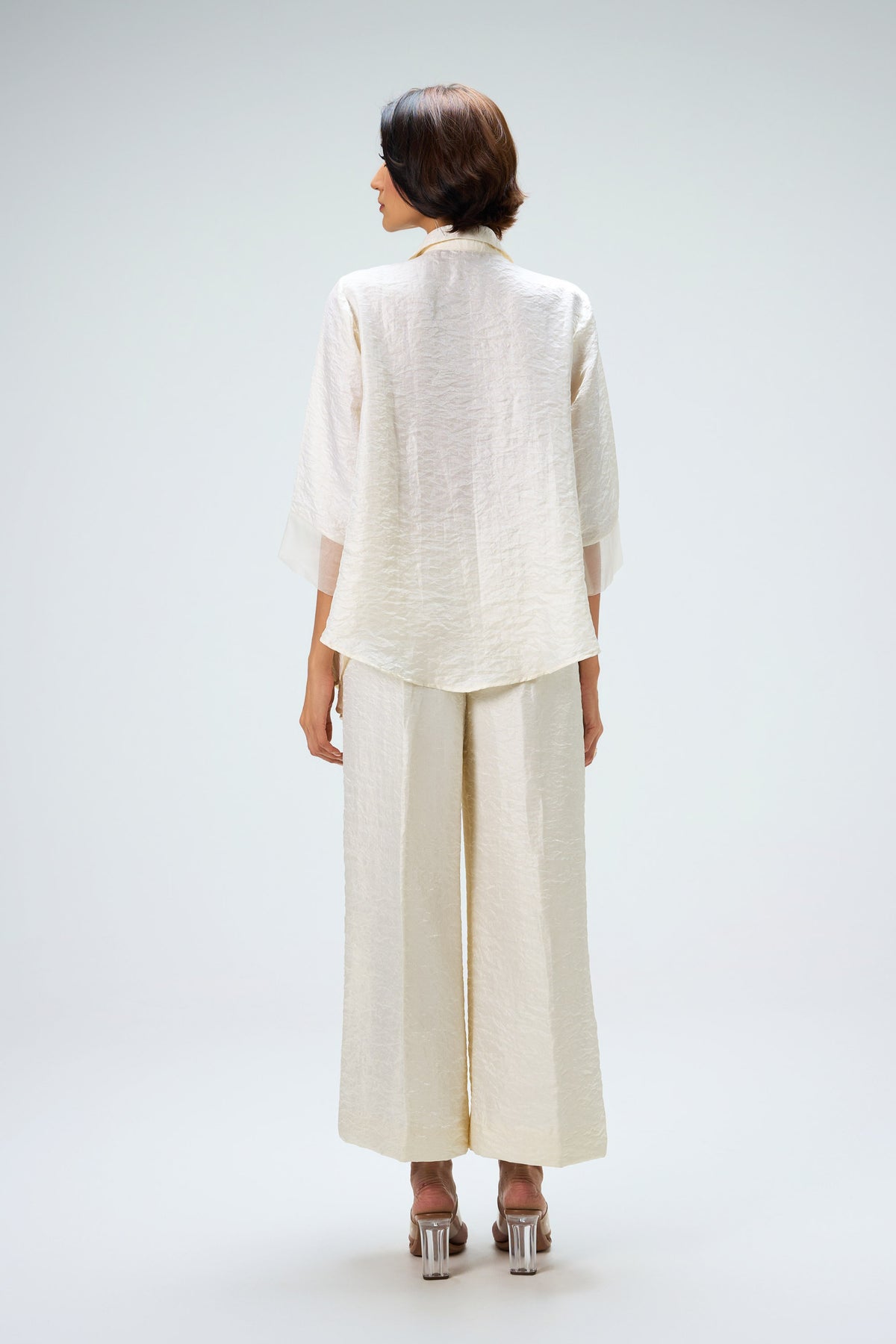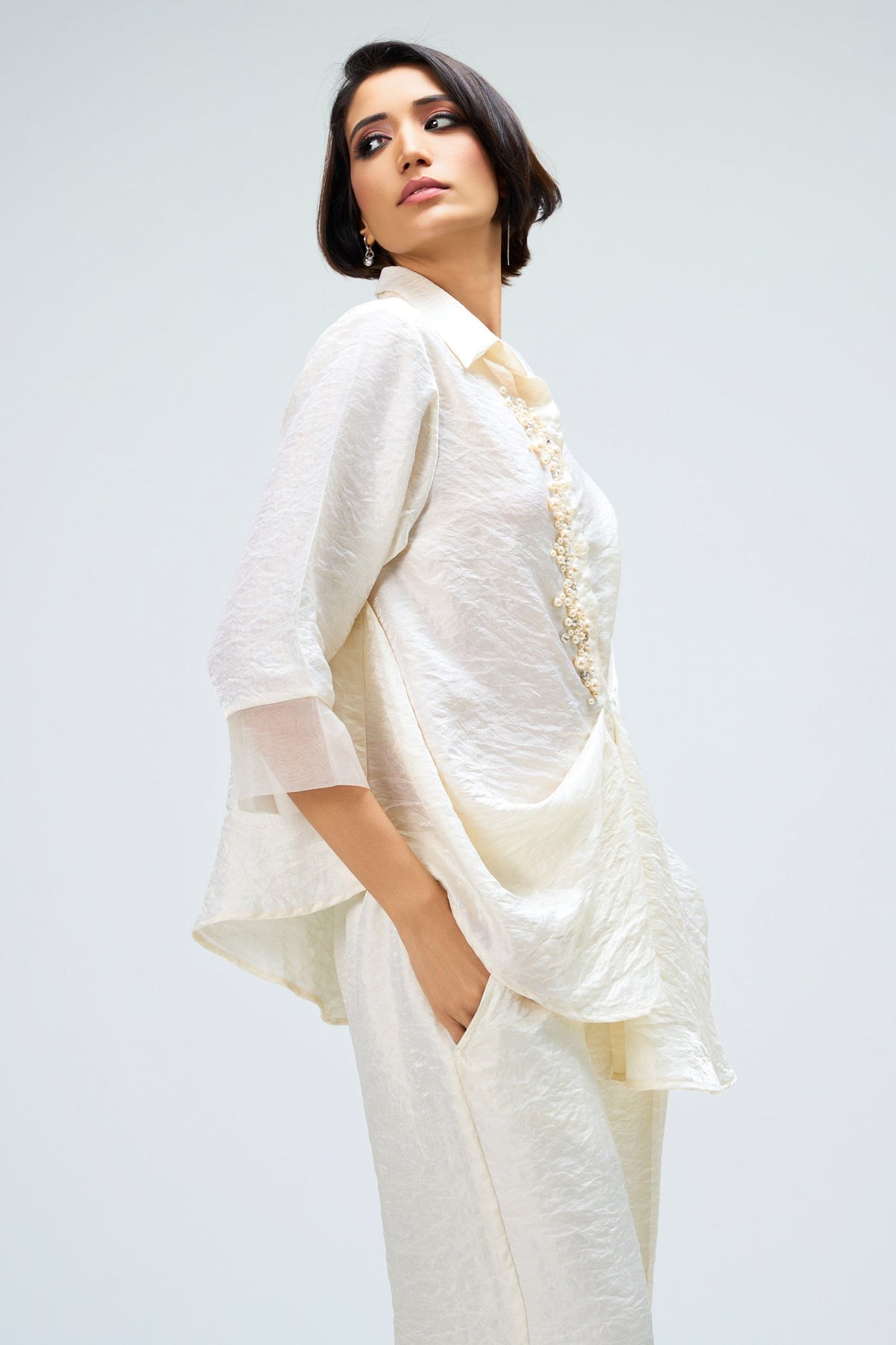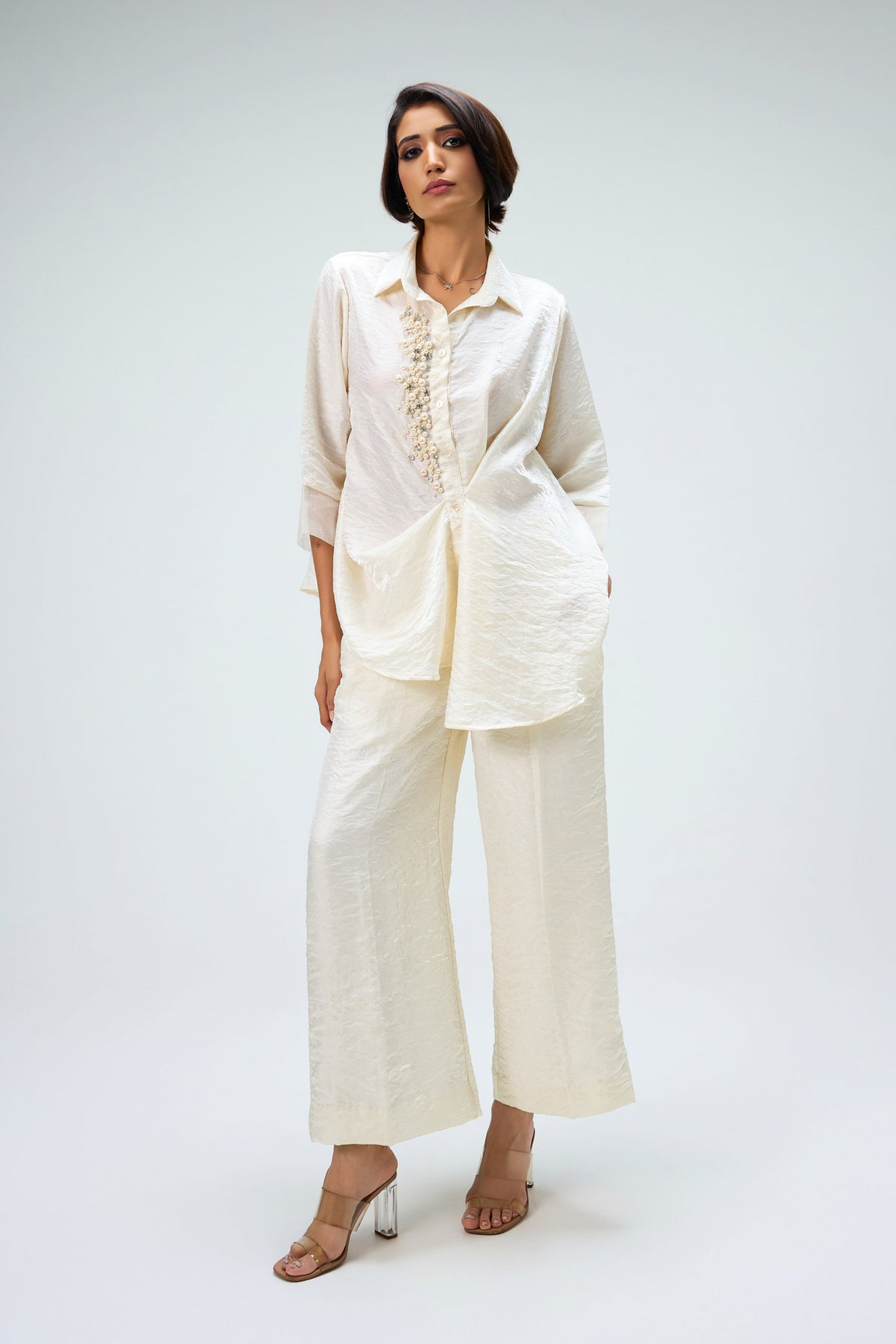 "Elara" Crafted in luminous ivory with pearl and crystal embellishments, this co-ord is designed for soirées and cocktails where the spotlight belongs to you.