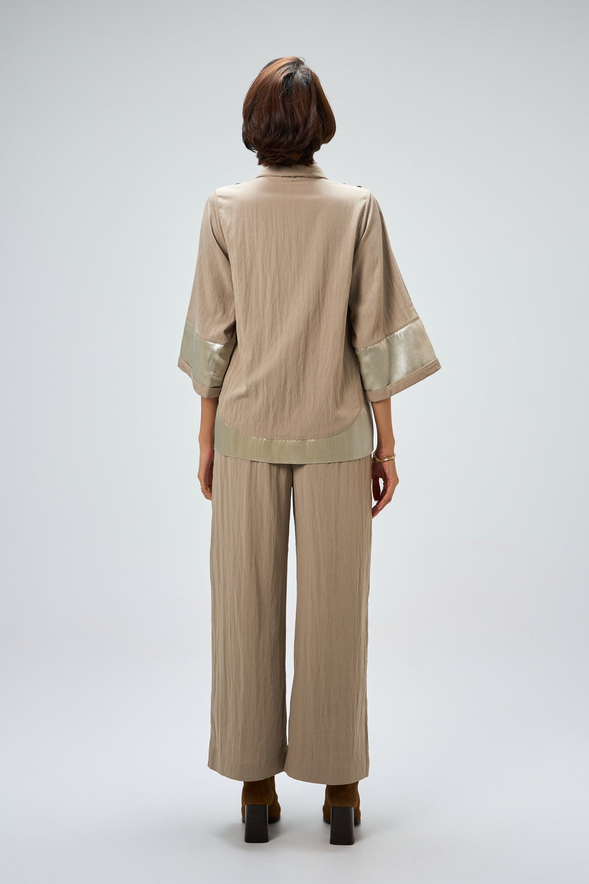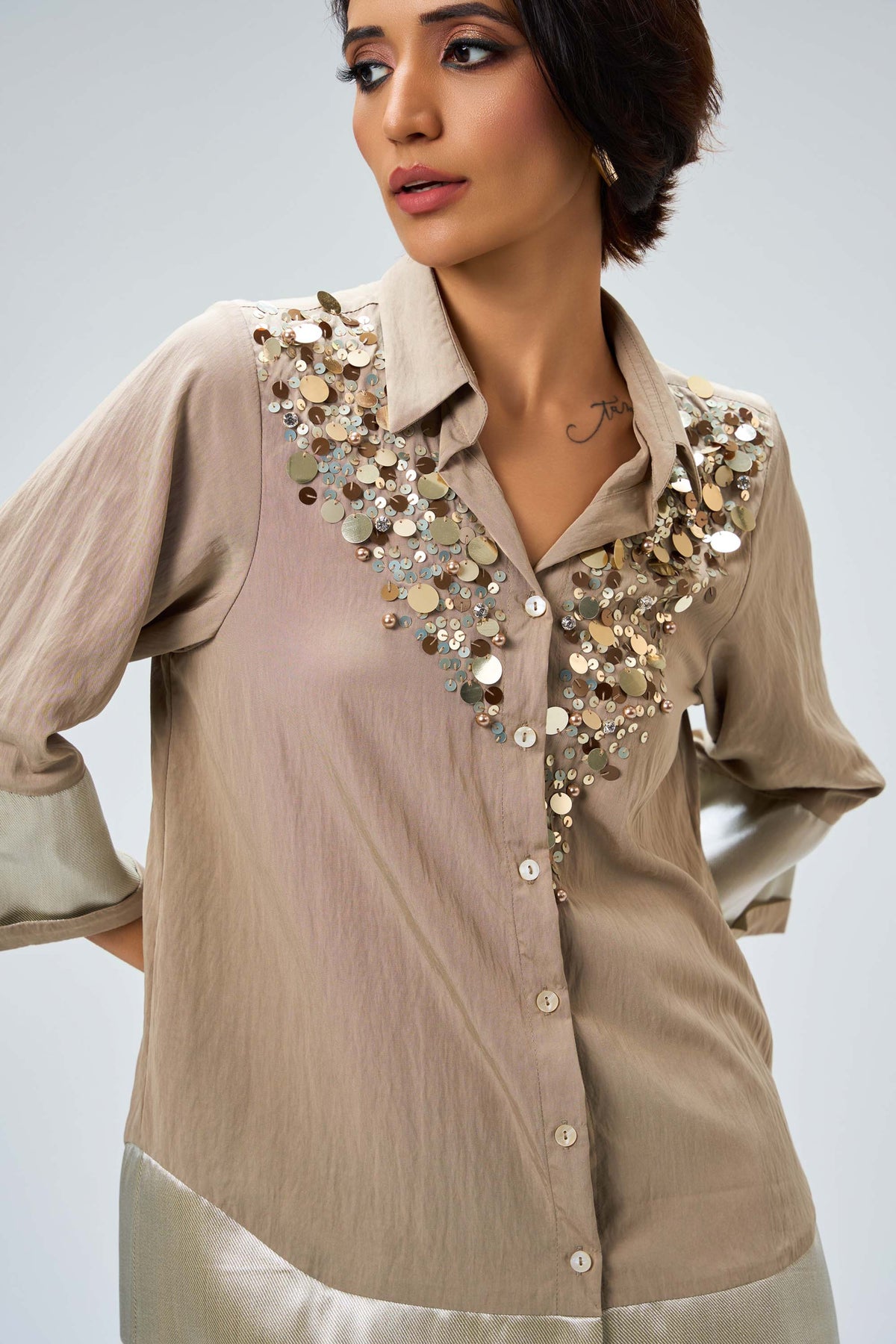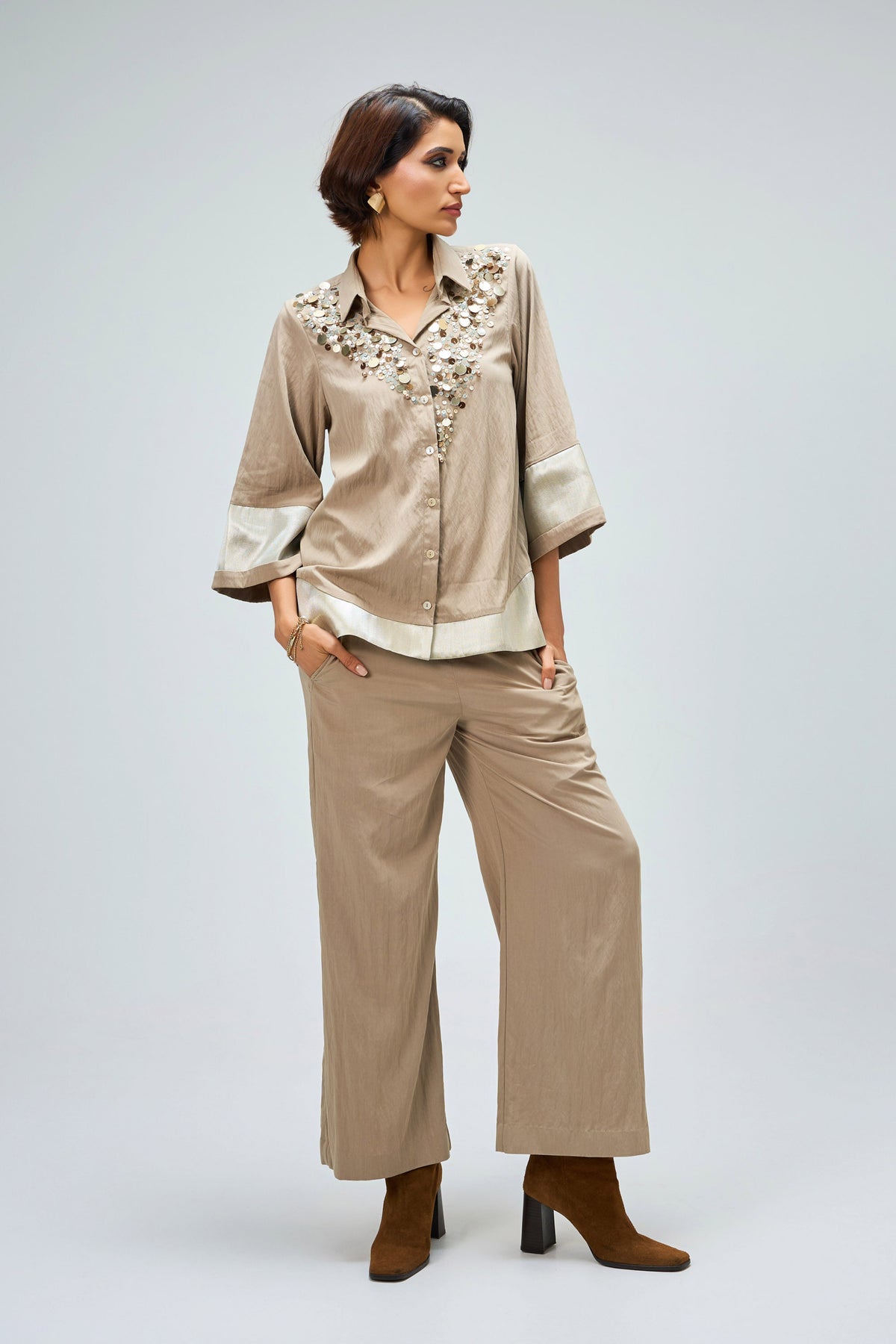 "Evoque", A taupe co-ord illuminated with gilded cuffs and a cascade of sequins across the neckline. Earthy yet radiant, it strikes the perfect balance between grounded elegance and luminous sophistication.