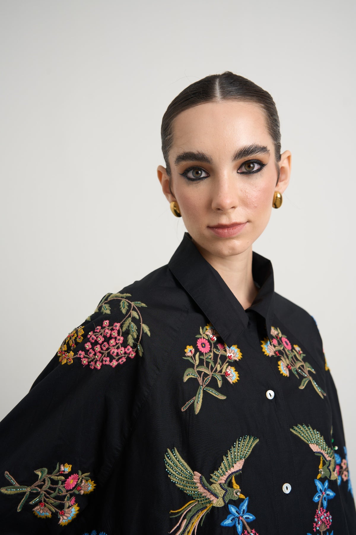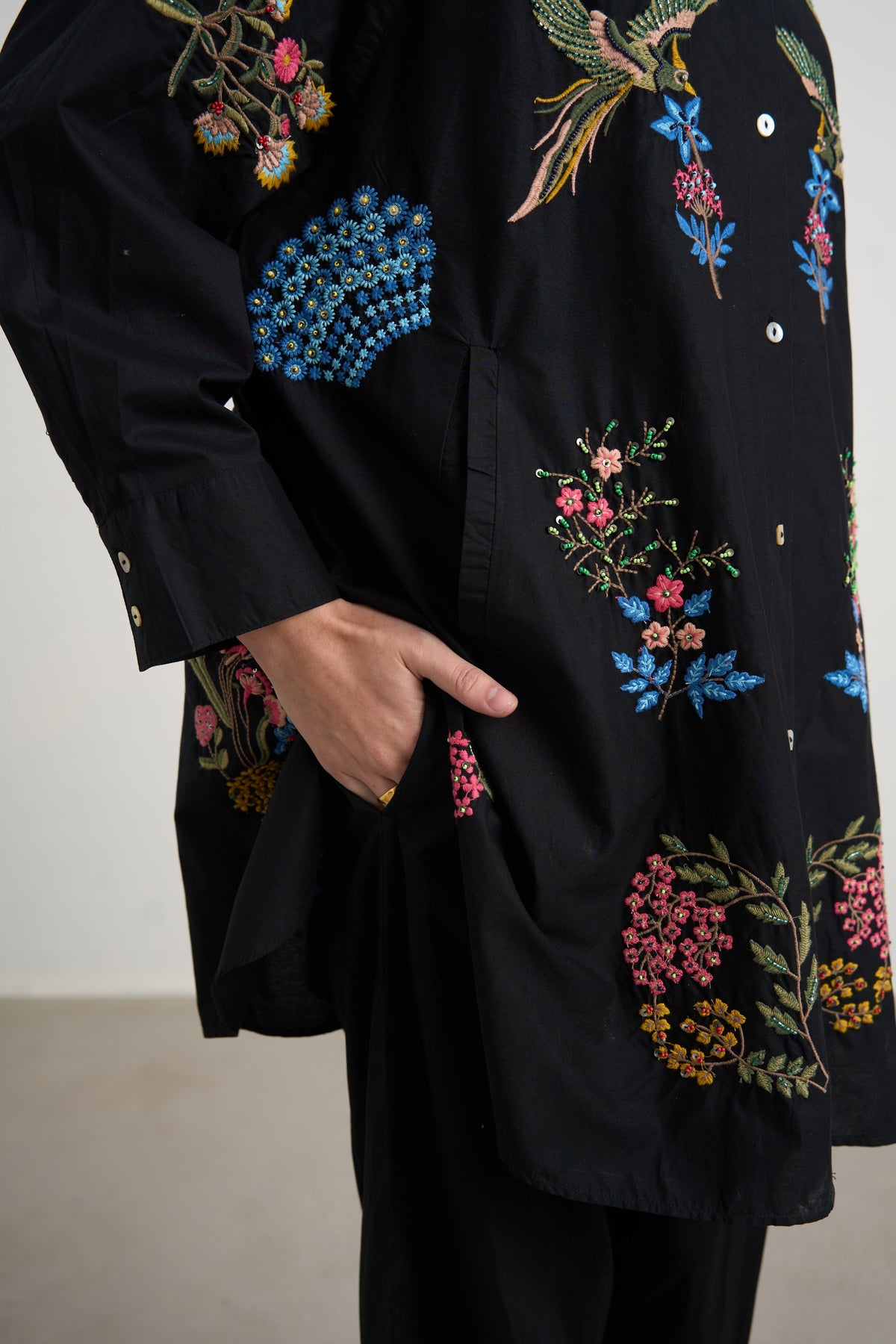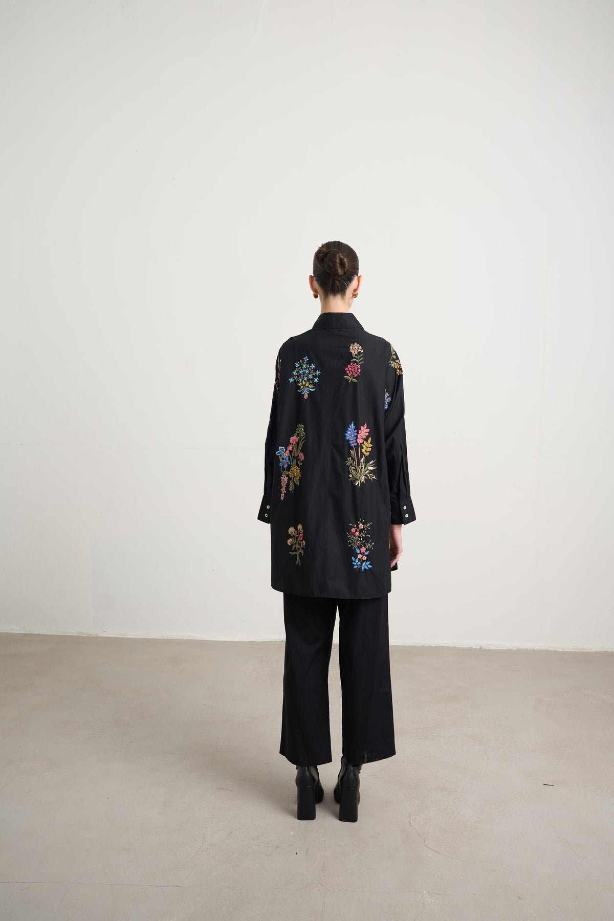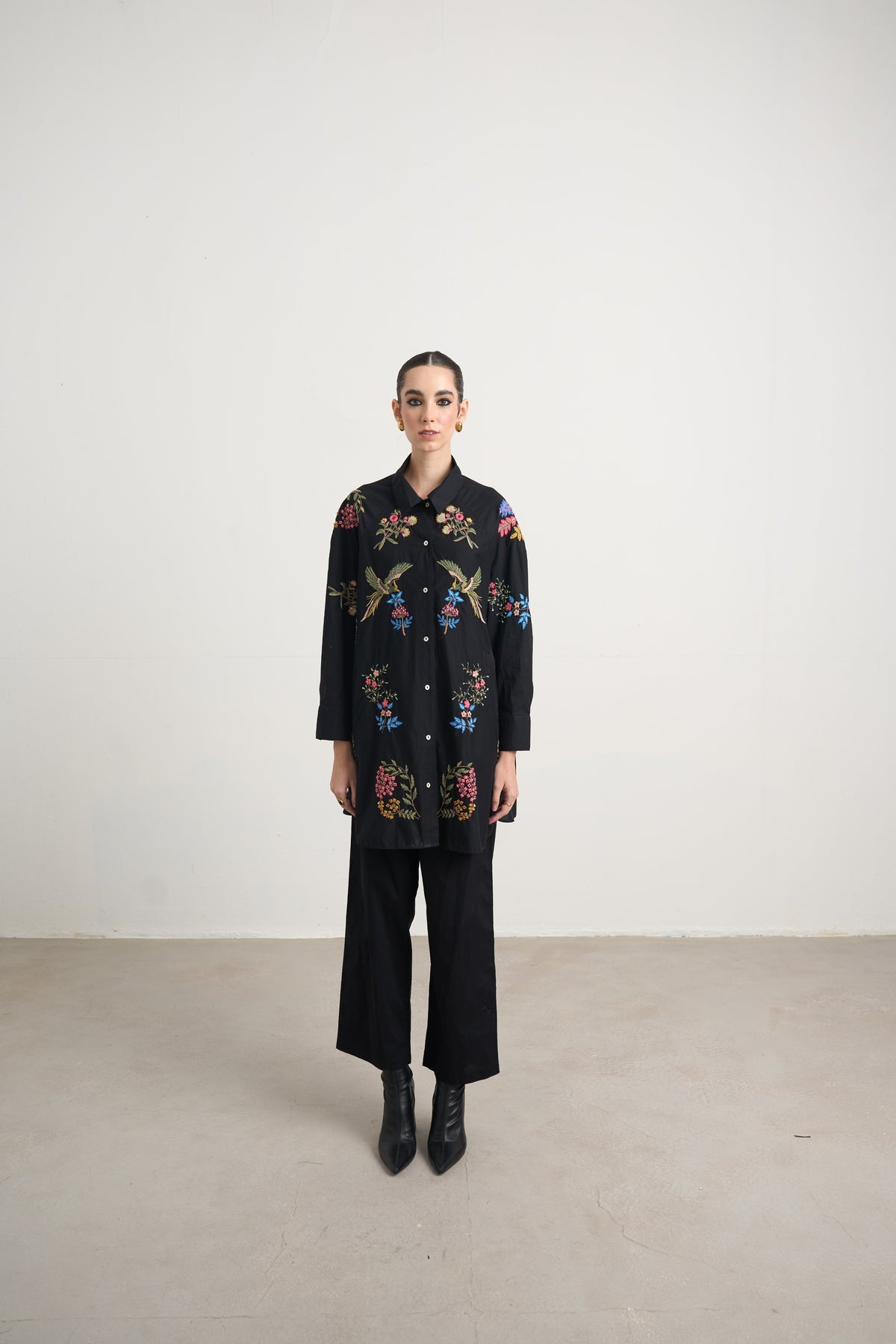 The Liora Set in breathable cotton features a relaxed shirt and pant silhouette designed for effortless ease. The button-down shirt is embroidered with multicoloured floral motifs, bringing vibrancy and texture to the minimal base. Easy, elevated, and full of charm, it’s an everyday statement with a playful edge.