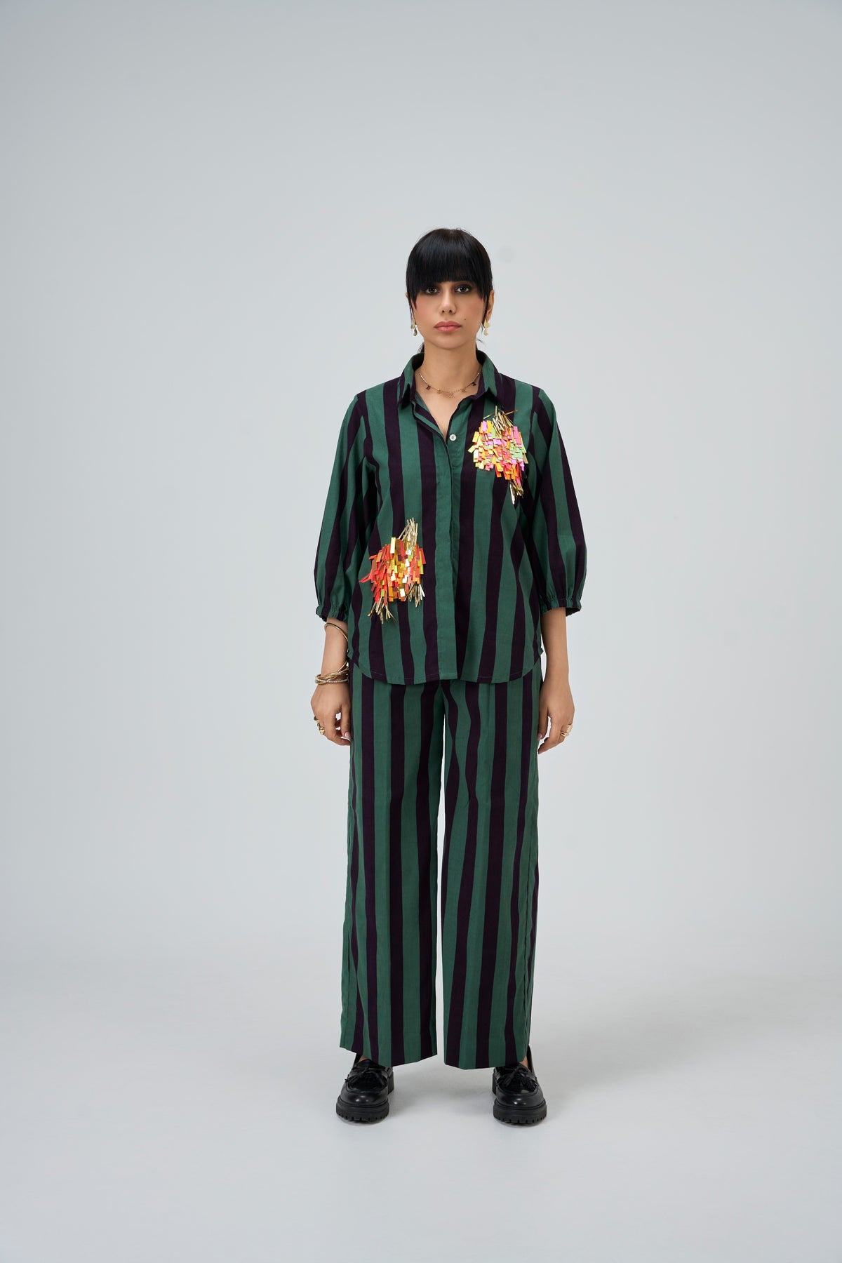 Whispering tales of twilight gardens, Oleander wraps you in soft cotton corduroy dreams. The shimmering striped shirt catches light like petals kissed by dawn, paired with relaxed flowing pants in deep forest and teal hues—an elegant harmony of texture and grace. A coord set that invites you to move through moments with quiet confidence and timeless charm.