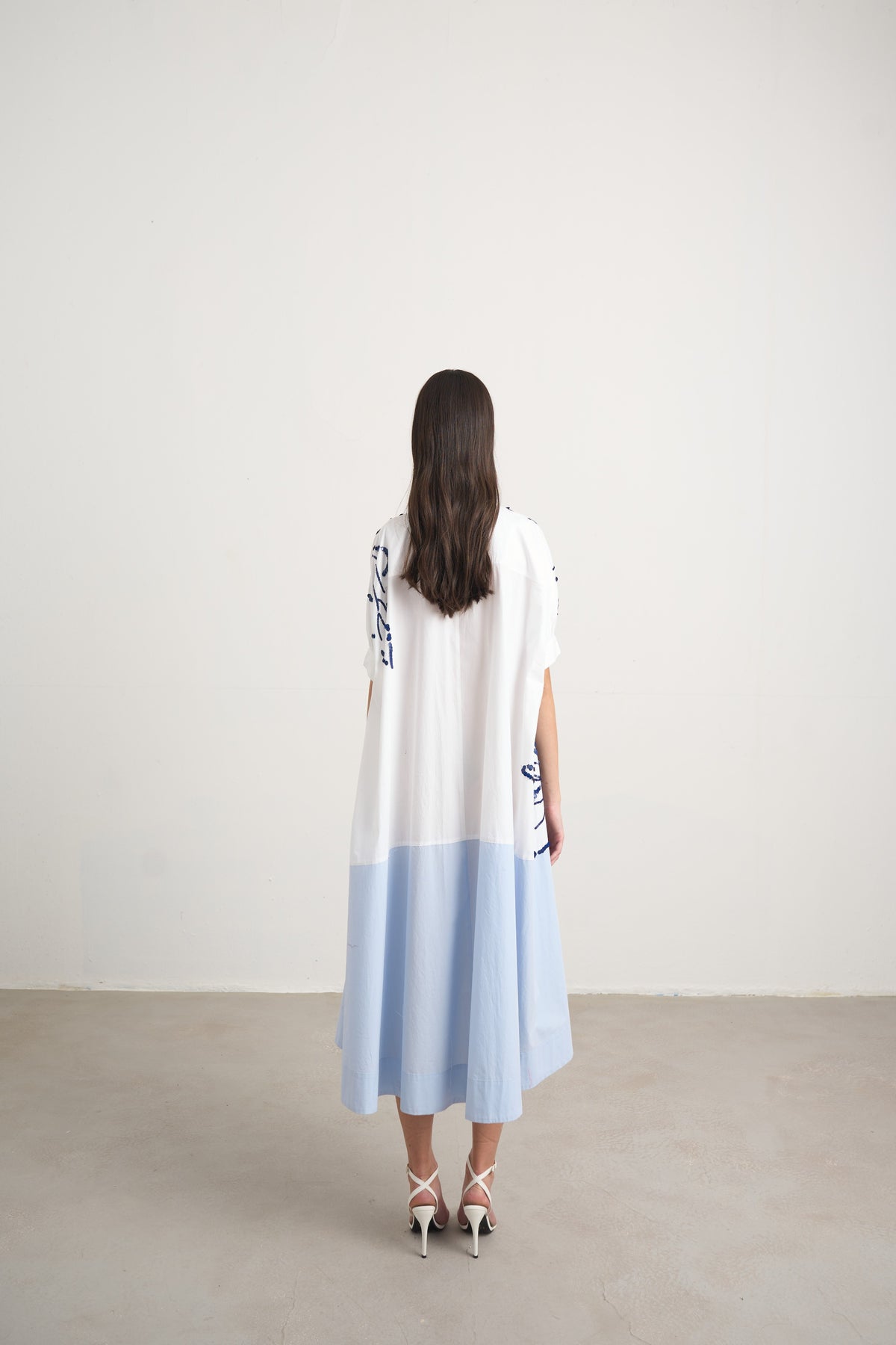 The Petra Dress is a cotton shirt dress with a sharp collar, front pocket, and half-cuffed sleeves. Cut in a high-low silhouette, it flares out dramatically for a voluminous shape. Hand-embellished floral motifs add a delicate artisanal charm. The base is in crisp white and powder blue color block panels, making it a perfect sophisticated, elegant daytime look.