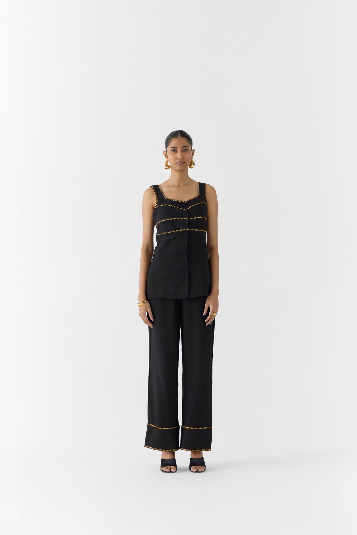The Onyx Linen Blazer & Trousers Co-ord crafted from our stunning viscose linen fabrication, trans-seasonal, is a statement piece. This blazer, in our onyx black, is hand embroidered with studs and has a front opening. It is lined and sleeveless. The cut of the bust is fitted and it has side slits. It is paired with our hand embroidered straight linen trousers. Wear it with heels for an elegant look.