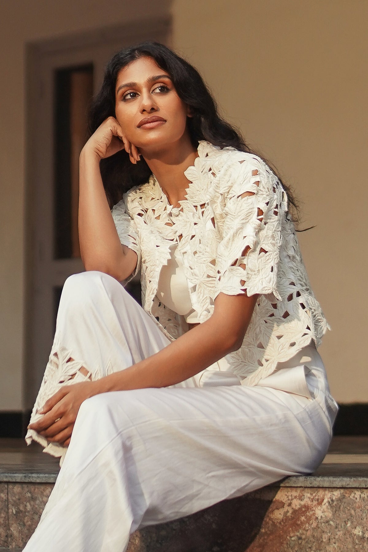 An ode to intricate handwork and quiet confidence. This statement jacket features delicate floral cutwork, crafted entirely in shades of ivory on soft cotton. Unlined for transparency and lightness, it comes with a matching plain bustier to layer underneath. The short-sleeved silhouette and cropped hem add structure while letting the embroidery breathe—perfect for days that call for detail and ease in equal measure.