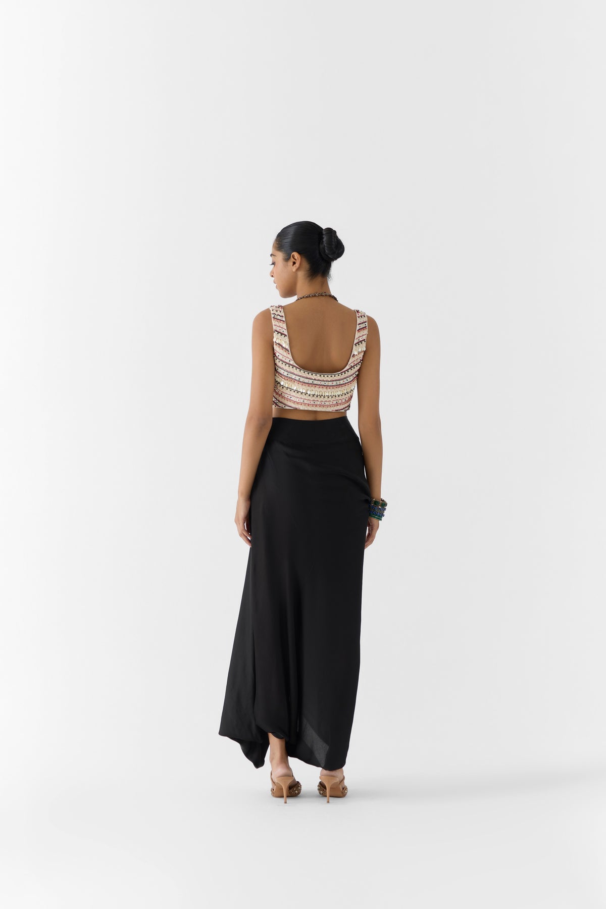 The Vintage Blouse & Knot Skirt, crafted from our stunning vegan silk & linen fabrication, trans-seasonal, is a statement piece. This blouse, hand-embroidered with lace and beads, is sleeveless. With a side zipper and a U-neckline, it is lined. It is paired with our hand-dyed black knot skirt. For an added look, it can be paired with our Tijori blazer. Wear it with heels for an elegant look.