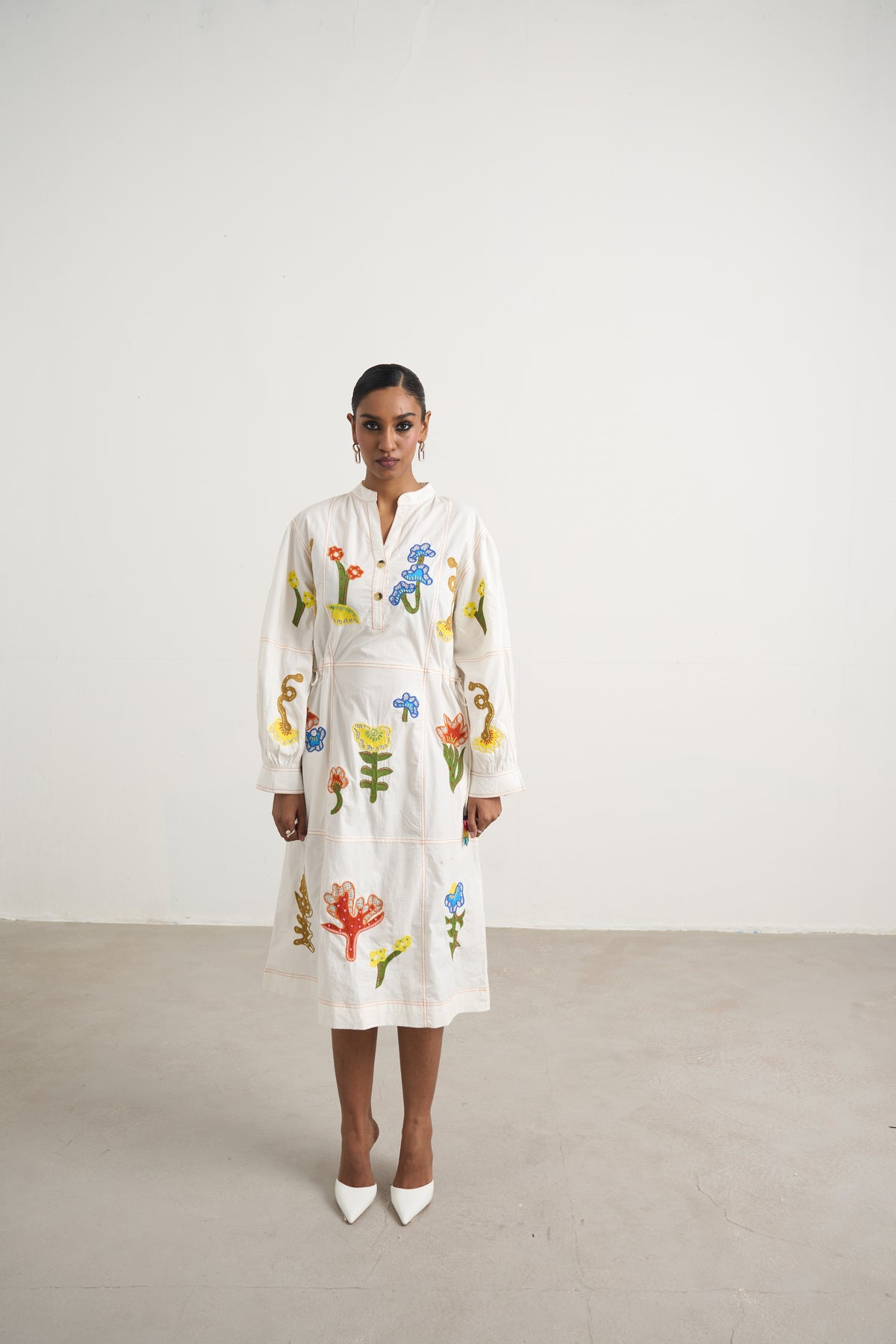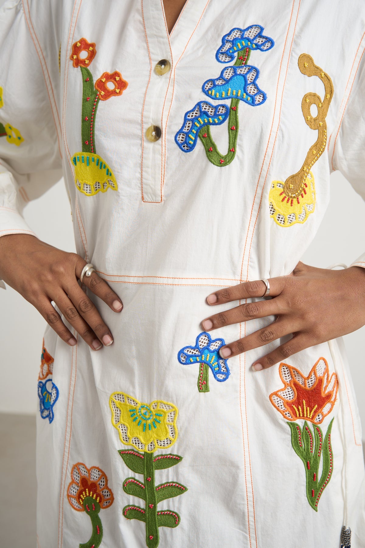 Crafted in crisp white cotton poplin, the Azara Dress features a straight, relaxed fit accentuated with contrast running stitch panelling. Multicolored patchwork appliqué adds a playful touch, while the 3/4 sleeves and neckline keep the look refined and effortless.