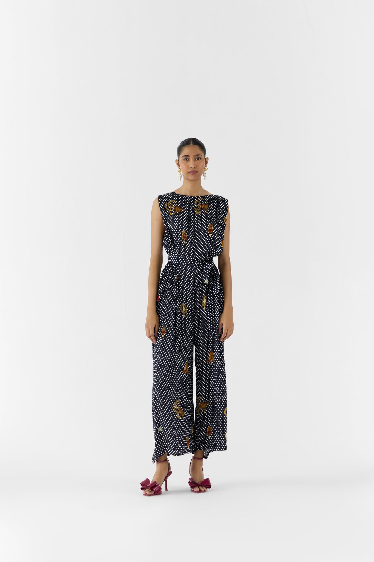 The Onyx Polka Dot Jumpsuit crafted from our stunning vegan silk fabrication, trans-seasonal, is a statement piece. This piece, printed in our jewels polka dot print, has a relaxed fit. The jumpsuit has a back opening with a knot. It comes with a belt and is sleeveless. It has a boxy fit. Wear it with heels for an elegant look.