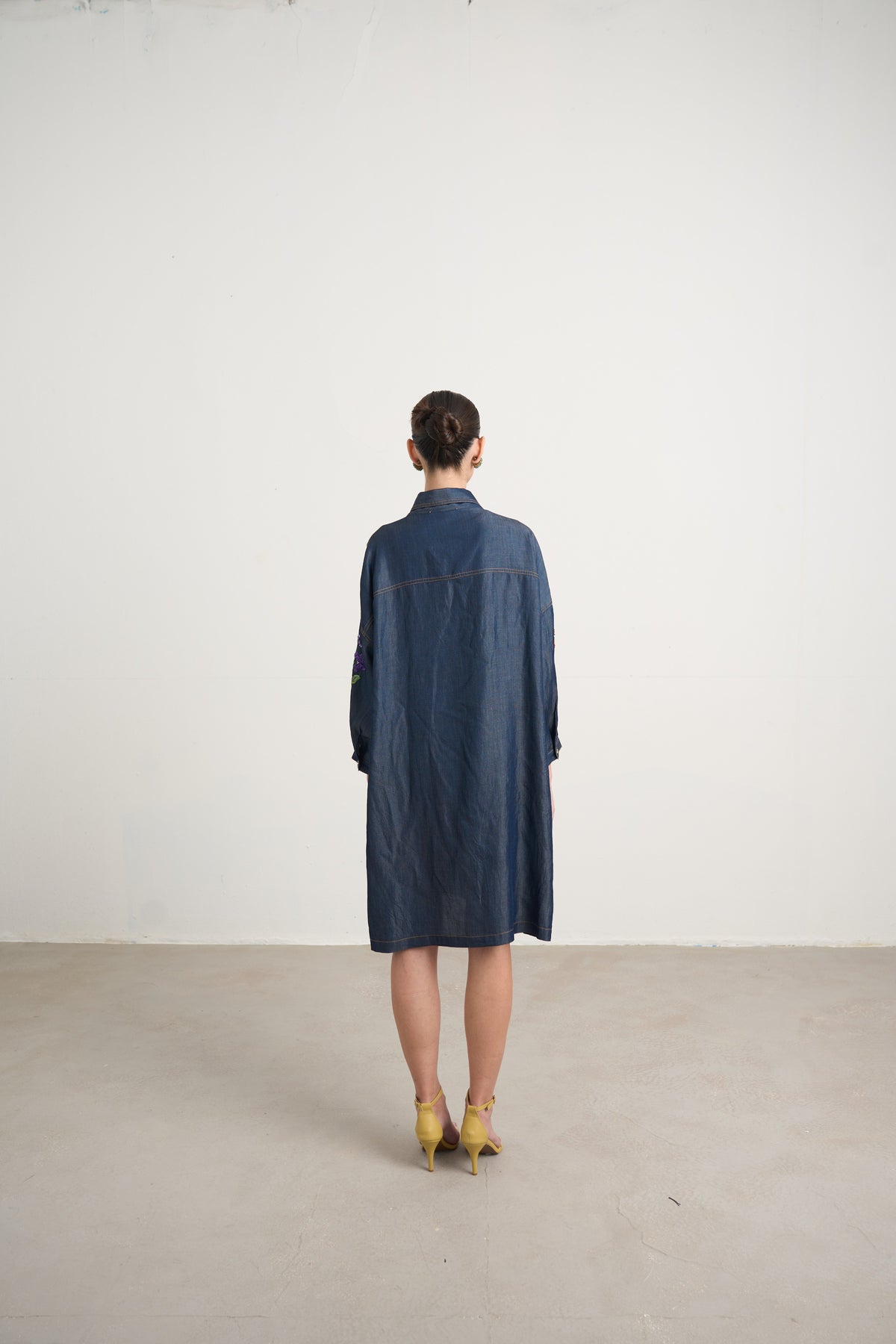 Crafted in soft dark denim, the Simone Dress reimagines the classic shirt dress with a laid-back silhouette and vivid hand-embroidered florals. A front patch pocket adds utility to its design, while small side slits finished with buttons offer subtle versatility. Designed for comfort with careful details, it's a statement piece you’ll reach for on repeat.