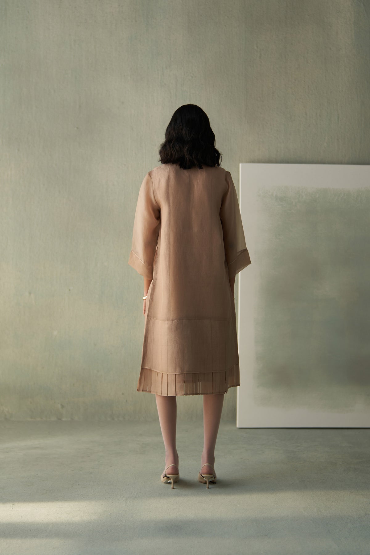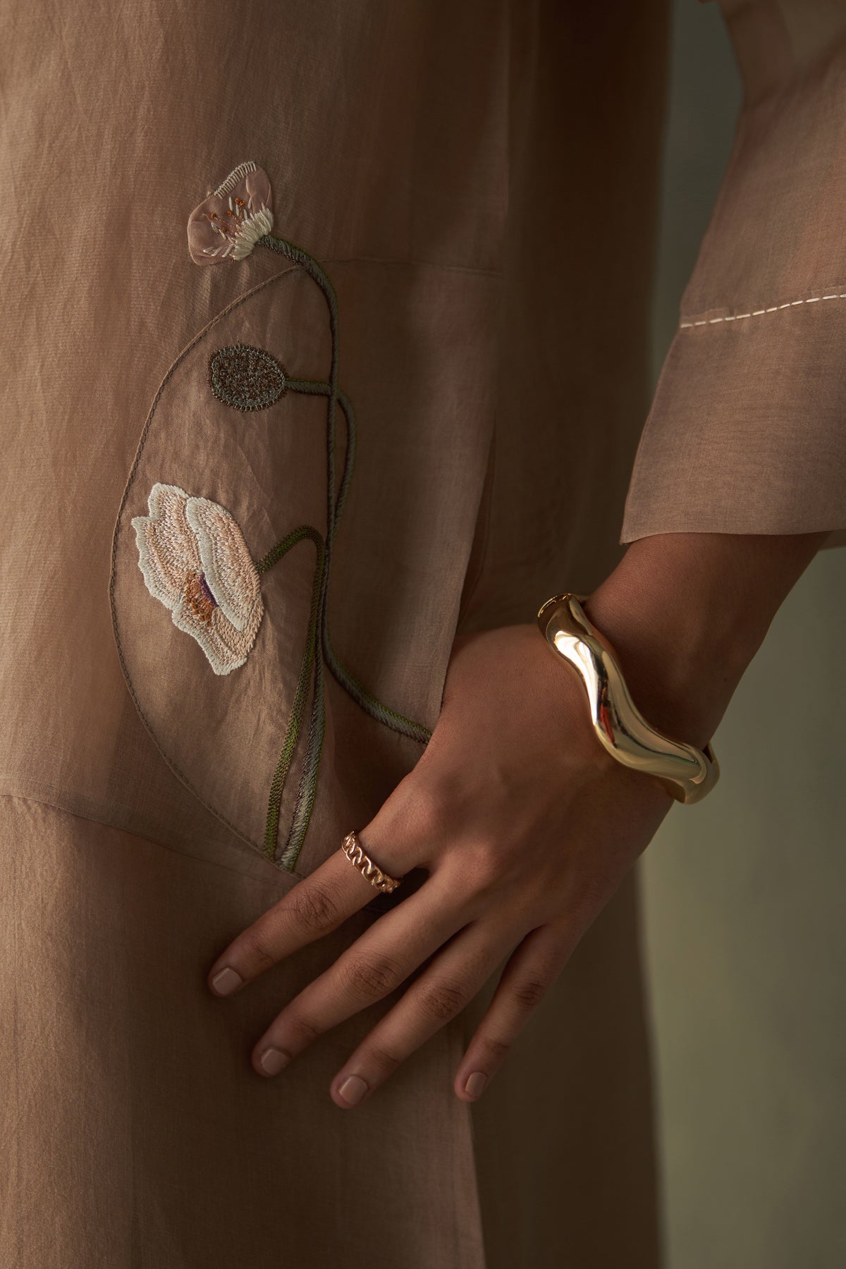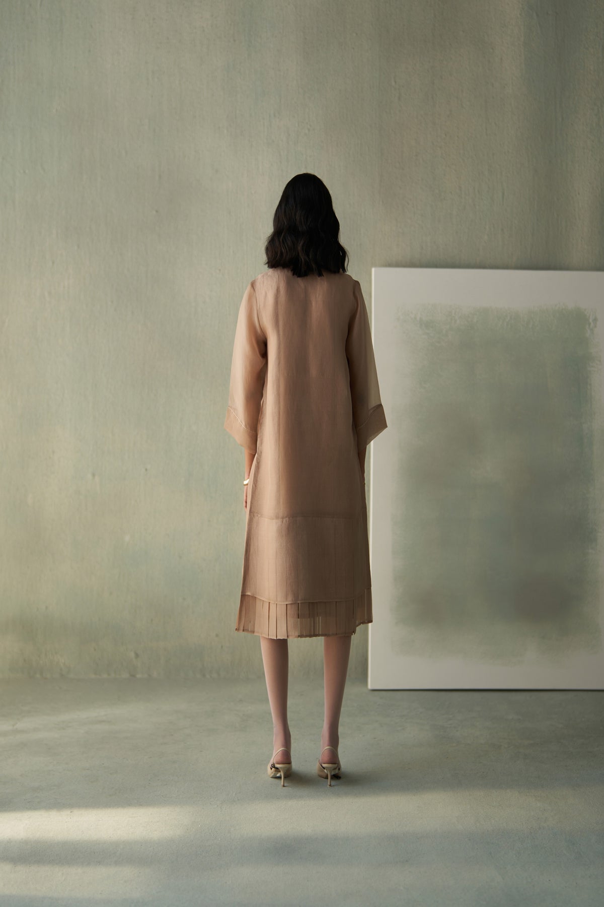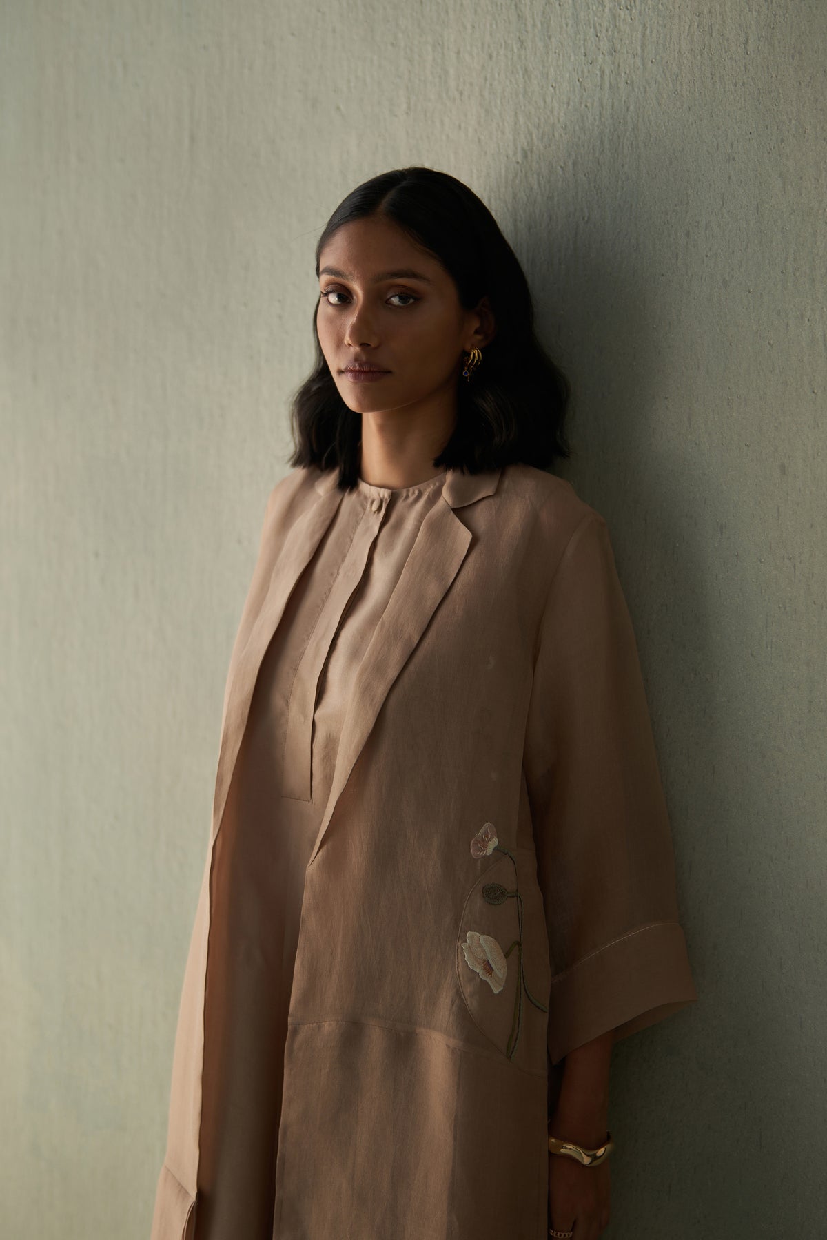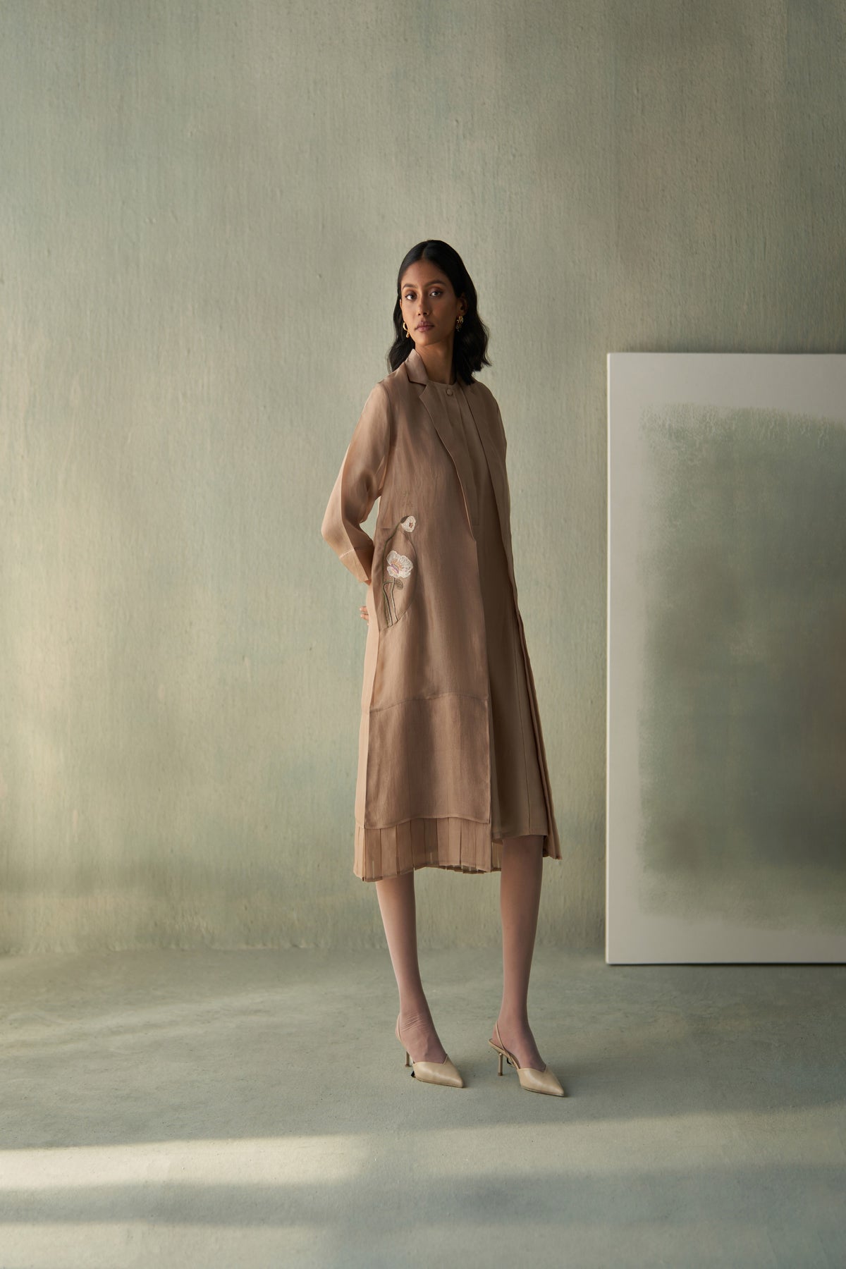 A sheer organza overlay in a soothing sand tone, featuring delicate hand-embroidered floral motifs on the pockets and soft pleated panels in layering. The longline silhouette with tailored lapels adds structure, while its fluid drape brings effortless movement — a versatile option for layering over dresses or separates.
