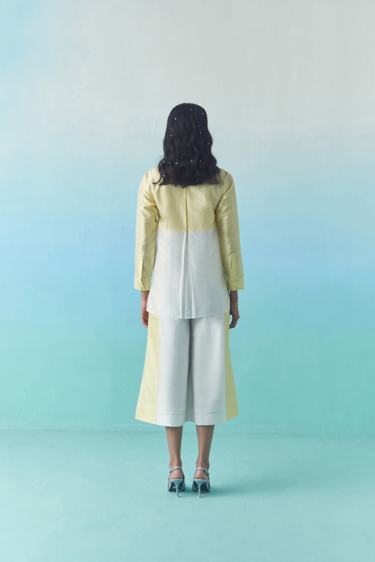 A Set Of Color Block Silk Co-Ord, Featuring Hand Done Details On The Front Of The Top And Culottes.