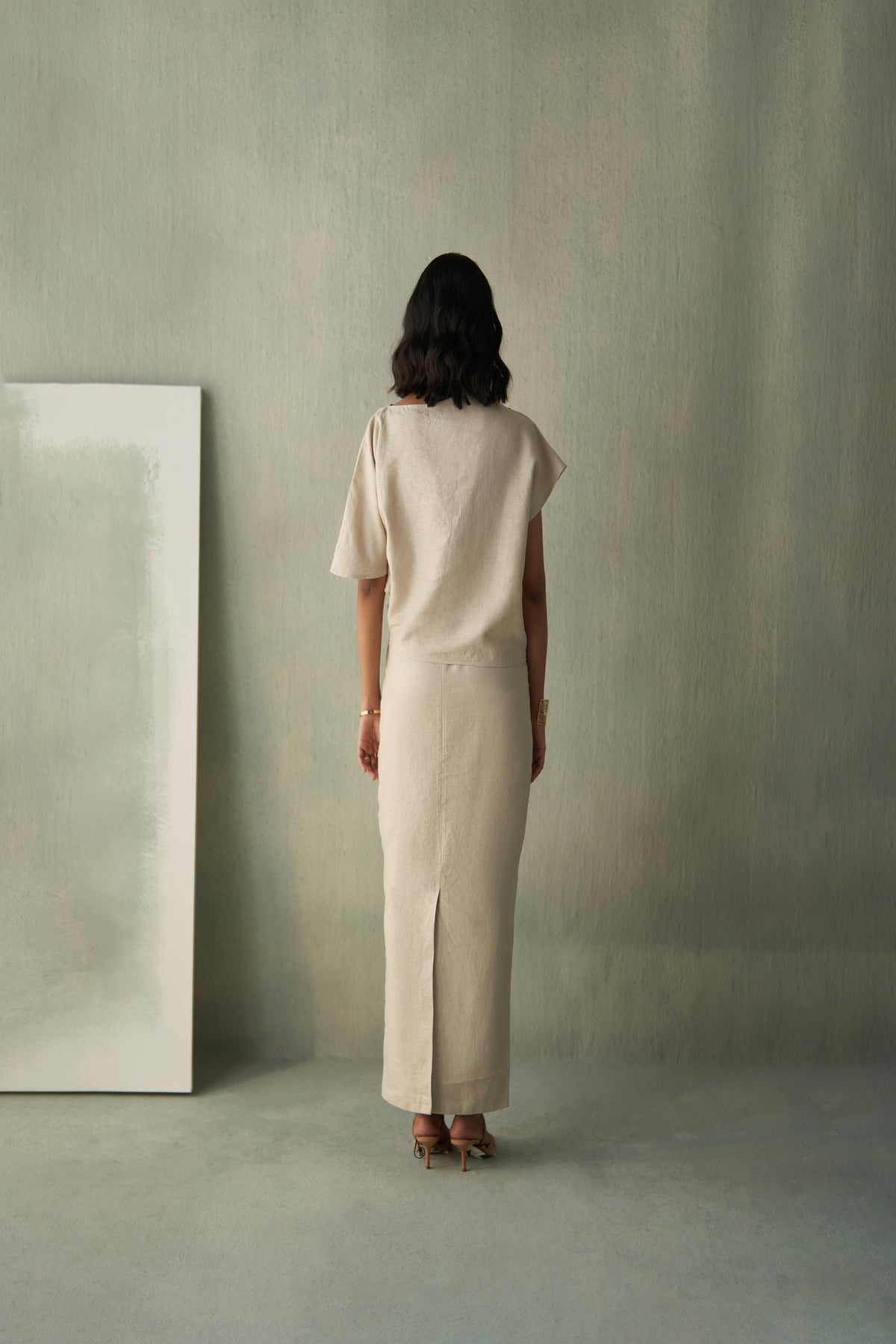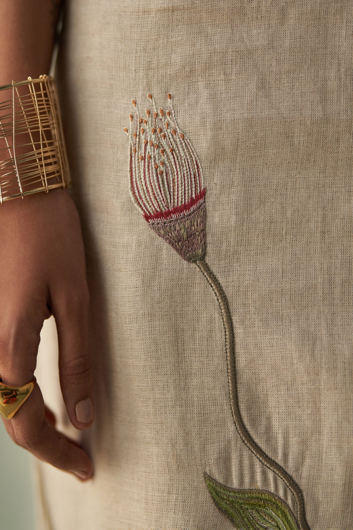 Inspired by the quiet beauty of arid landscapes, this linen co-ord set features a relaxed asymmetric top paired with a straight-fit skirt. The natural beige hue is brought to life with delicate hand embroidery of blooming pods in soft desert tones. Lightweight yet structured, it embodies effortless sophistication — perfect for understated daytime outings or serene evening wear.