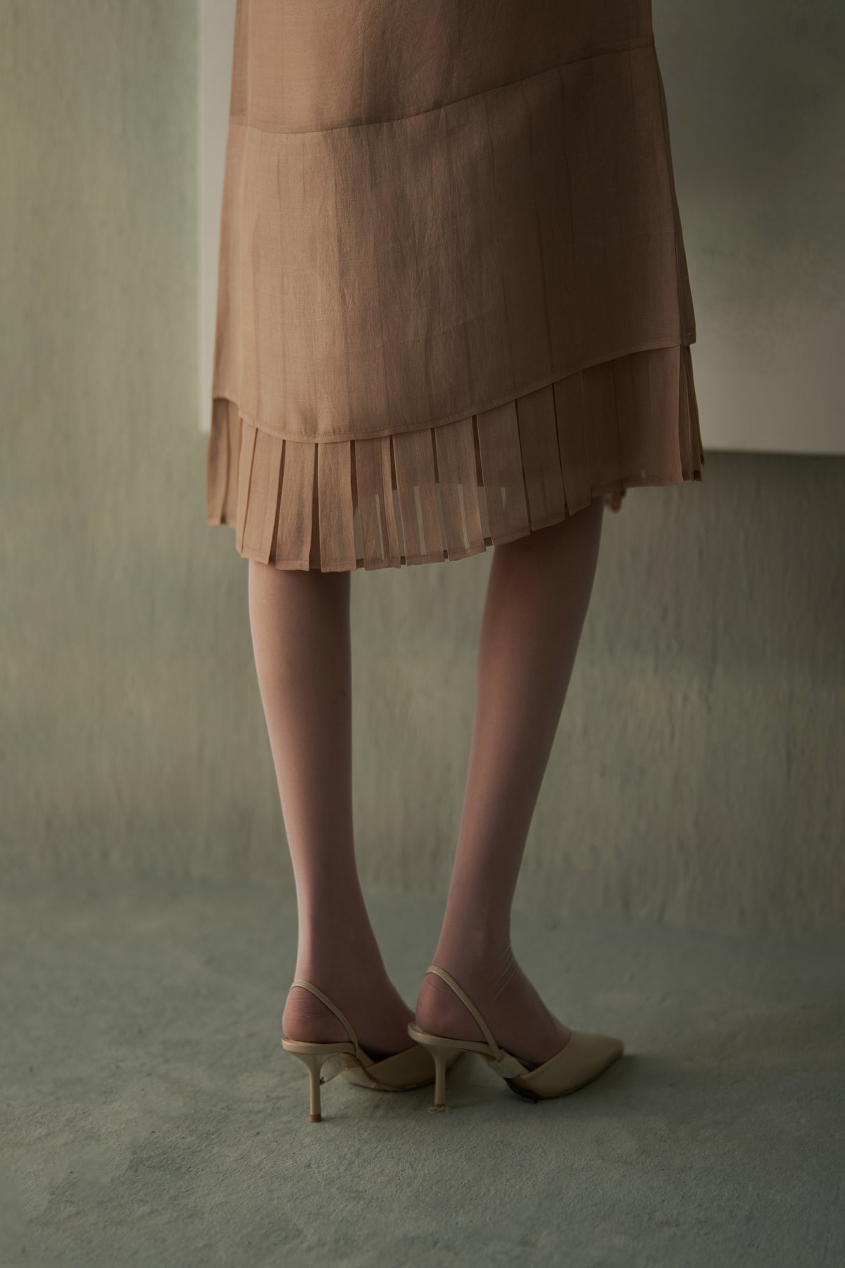 A sleeveless silk dress in a warm sand hue, detailed with delicate botanical embroidery and fine pintucked panels. The soft sheen of silk paired with nature-inspired threadwork lends it a refined yet organic charm and effortless understated femininity.