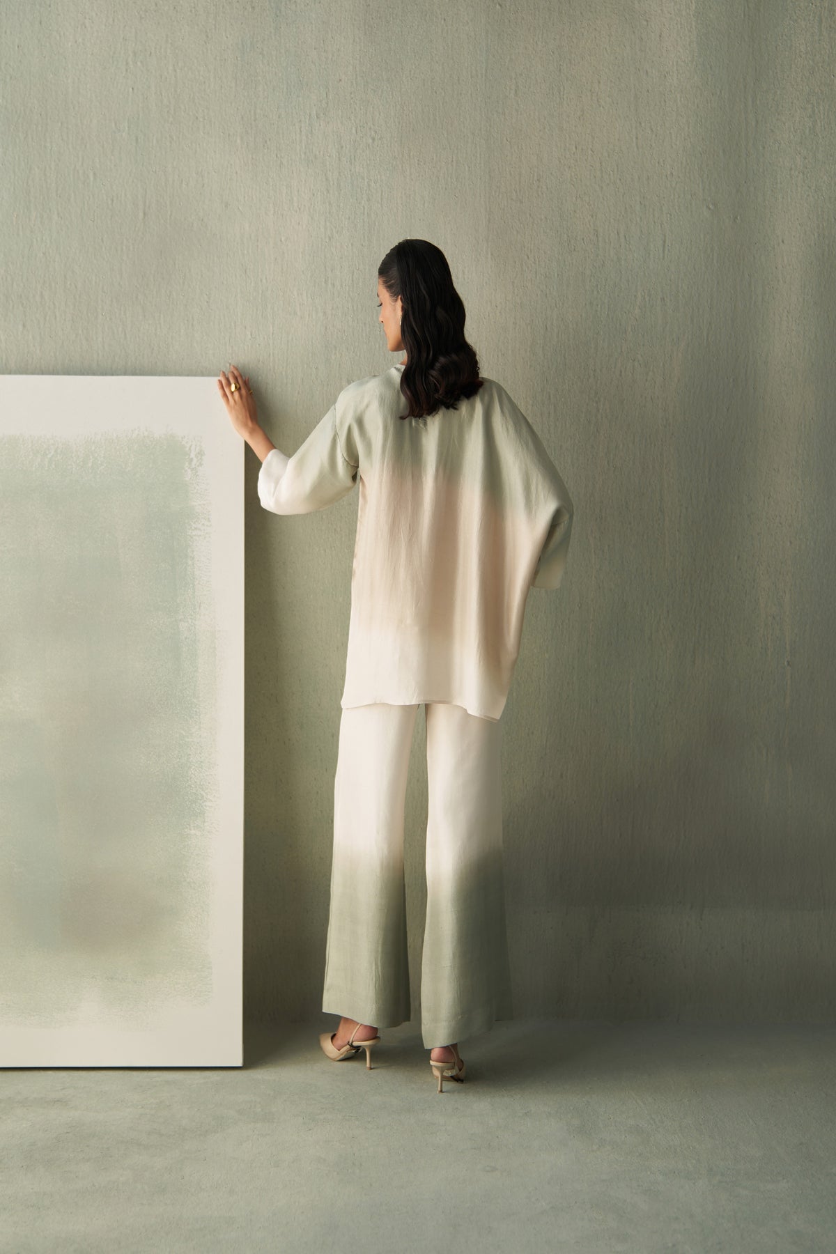 A serene blend of art and fluidity, this silk co-ord set features a hand-dyed ombré gradient in soothing desert tones. The relaxed, anti-fit top features asymmetric shoulders and showcases intricate hand embroidery inspired by nature’s forms, paired with wide-leg trousers that flow effortlessly. Elegant, airy, and timeless — a statement in quiet luxury.