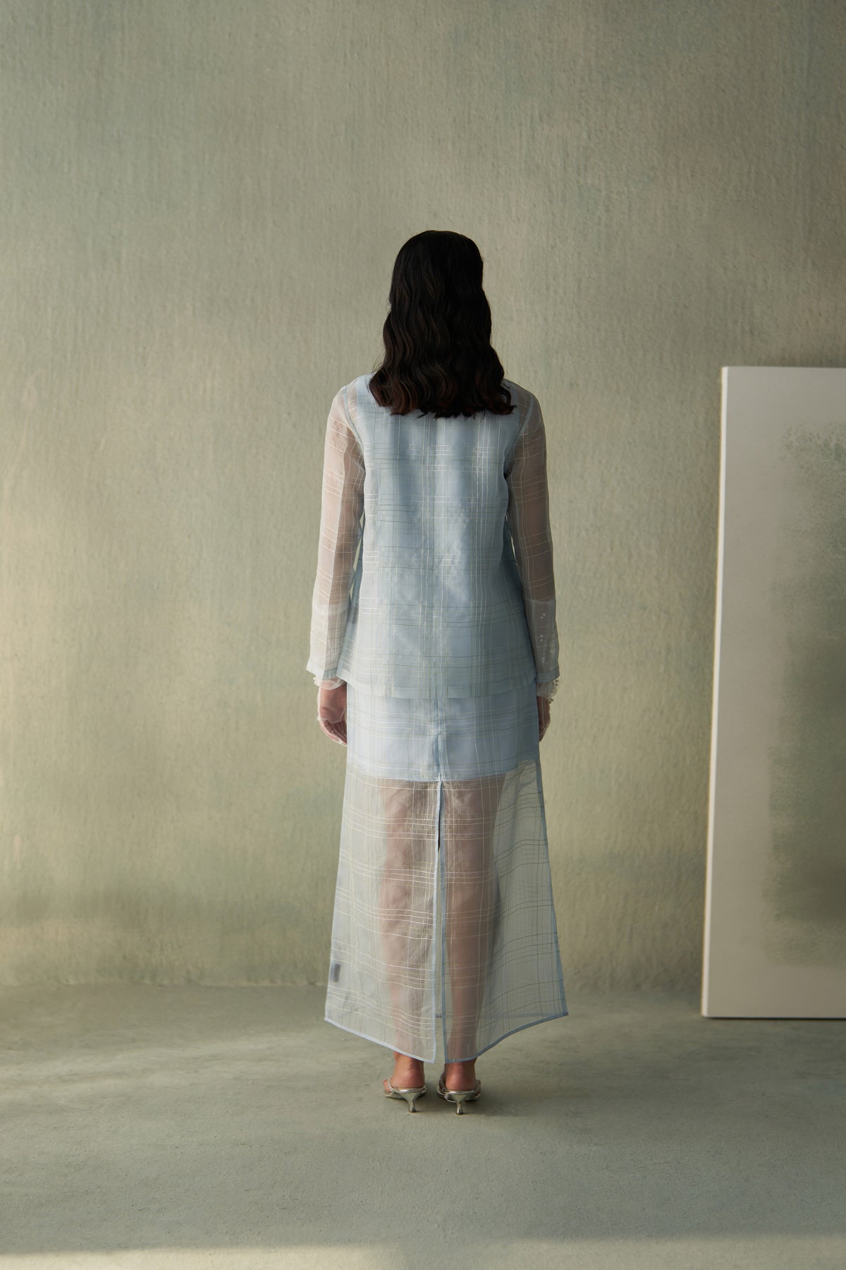 An ode to power dressing, this coordinated set features a sky-blue semi-sheer dress layered with a monochrome organza jacket. The dress, with its soft grid pattern and graceful translucence, represents poetic minimalism while the sheer jacket adds structure with the same grid detailing and delicate hand embroidery. Together, they create a harmonious balance of softness and strength — a serene statement in contemporary femininity.
