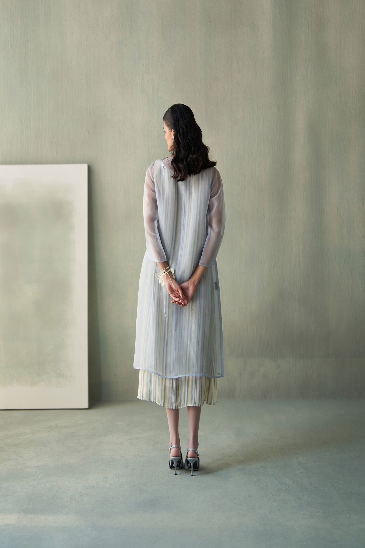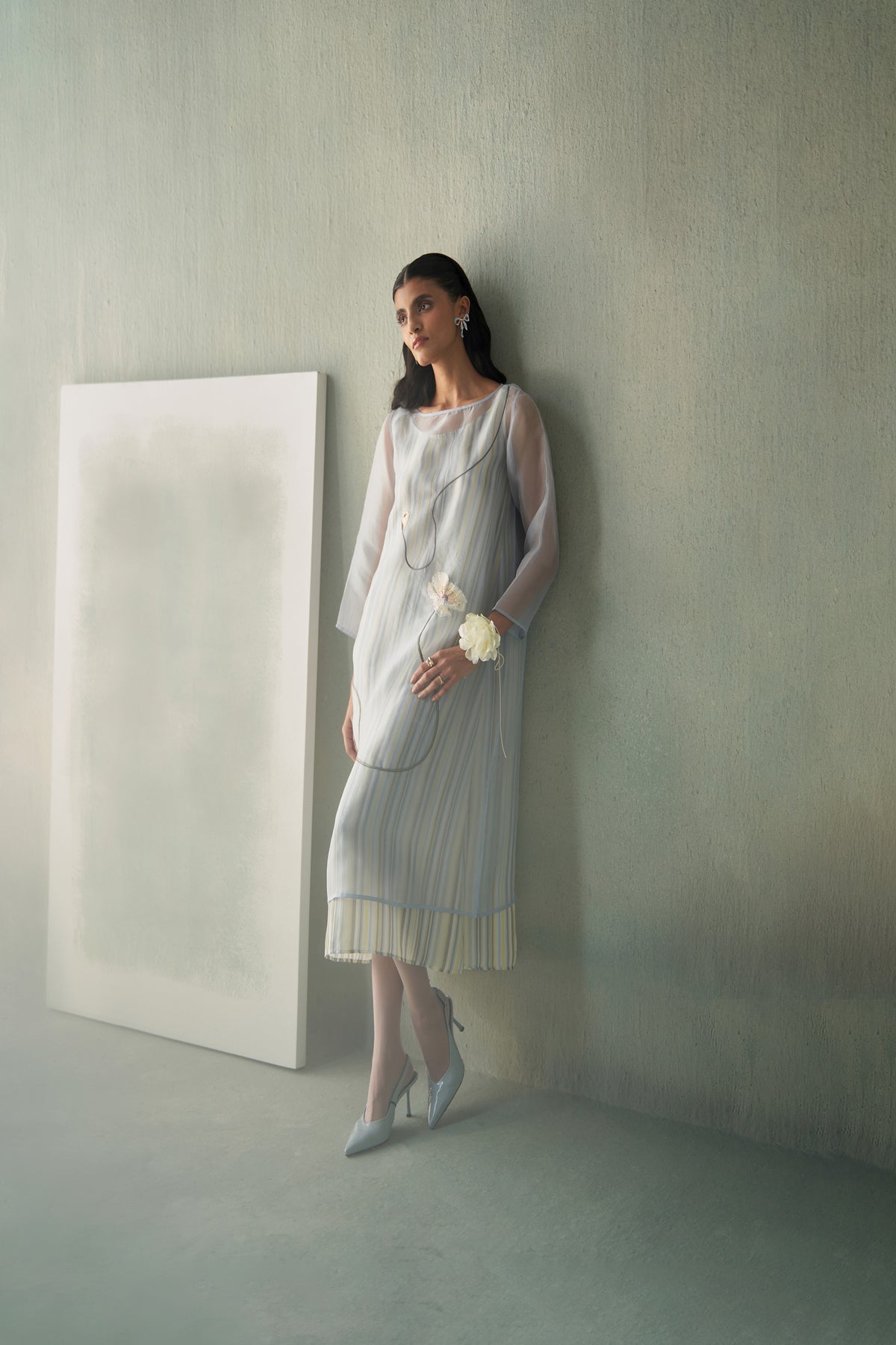 A dreamy organza tunic layered over a striped silk slip dress in soft sky tones. The sheer overlay features delicate hand embroidery of blooming pods, adding movement and artistry to its fluid silhouette. Light, airy, and graceful — it captures the essence of morning serenity with a touch of ethereal charm.
