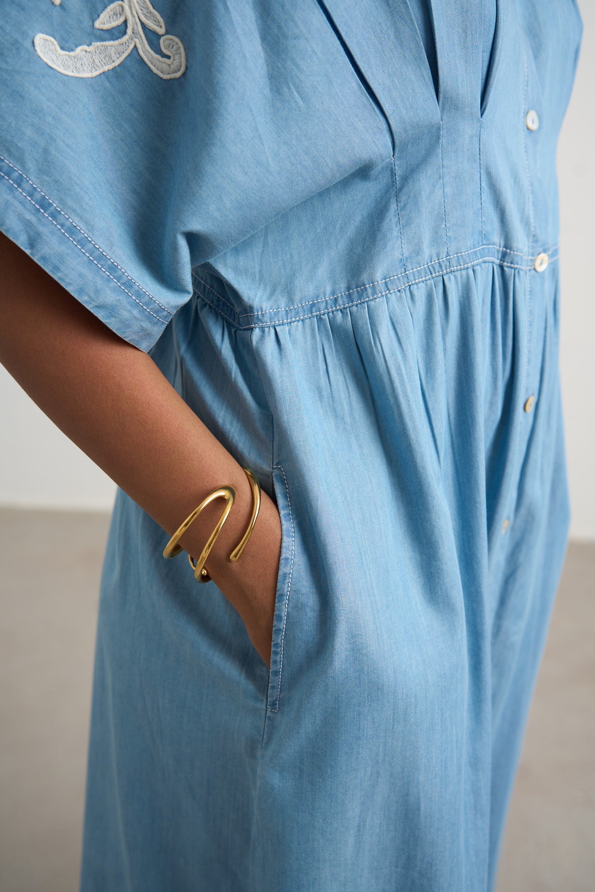 Embroidered with ivory-toned florals across the shoulders, the light denim Amara Dress captures a perfect balance of softness and structure. It features gathers at the bust, a gently cinched waist, short sleeves, and a full button-down front. The subtle seam detailing enhances its elegant midi-length silhouette.