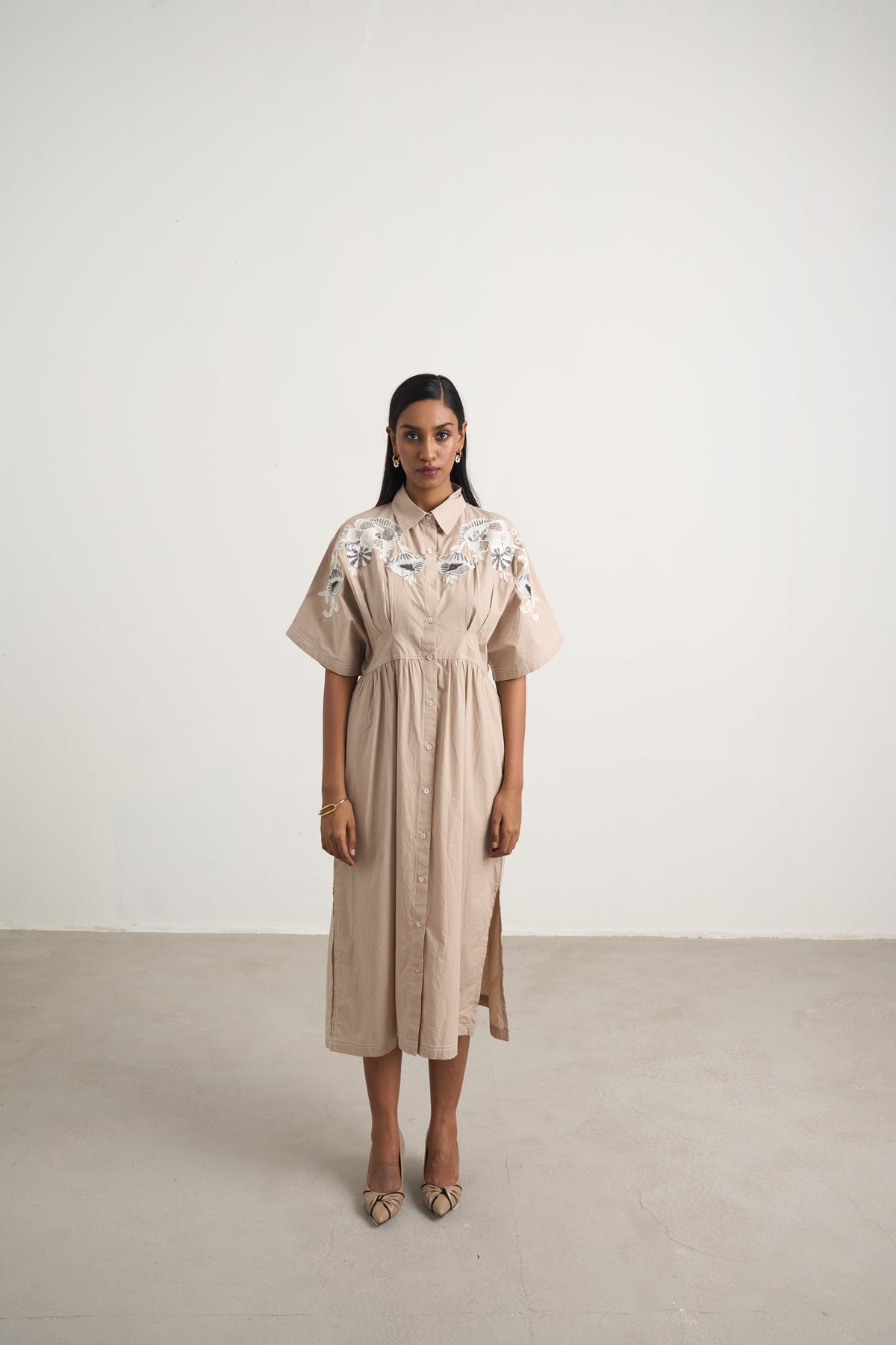 Embroidered with ivory-toned florals across the shoulders, the beige Amara Dress captures a perfect balance of softness and structure. It features gathers at the bust, a gently cinched waist, short sleeves, and a full button-down front. The subtle seam detailing enhances its elegant midi-length silhouette.