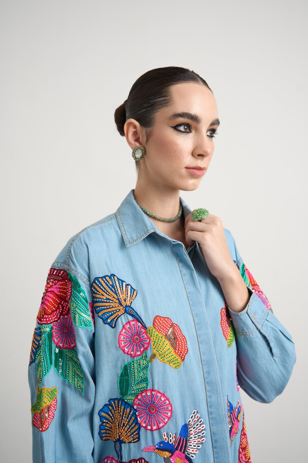 The Maia Dress is crafted in soft denim and features a relaxed, straight-falling silhouette with subtle side slits and a full button-down front. The 3/4th cuff sleeves add a gentle structure, and the vibrant floral embroidery brings a colorful handcrafted charm to the dress.