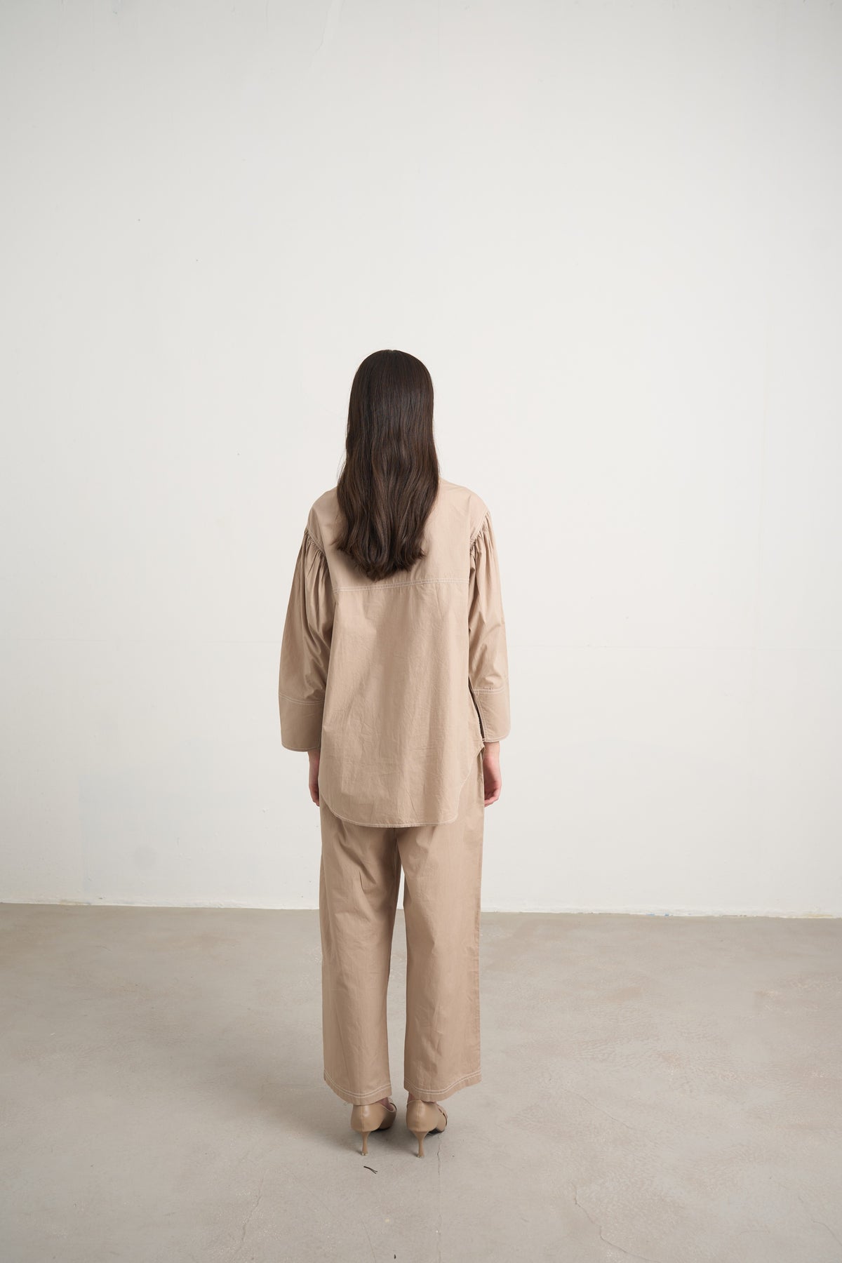 Valora Set features intricately hand-embroidered tonal floral motifs and embellishments. The embroidery is framed on a relaxed button-down shirt with voluminous gathered sleeves, paired with straight-fit pants with an elasticated waist for all-day ease.