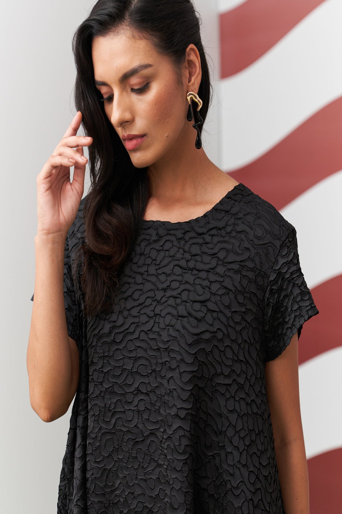 Featuring a black top with an asymmetric hem in textured fabric. It is paired with matching textured pant.