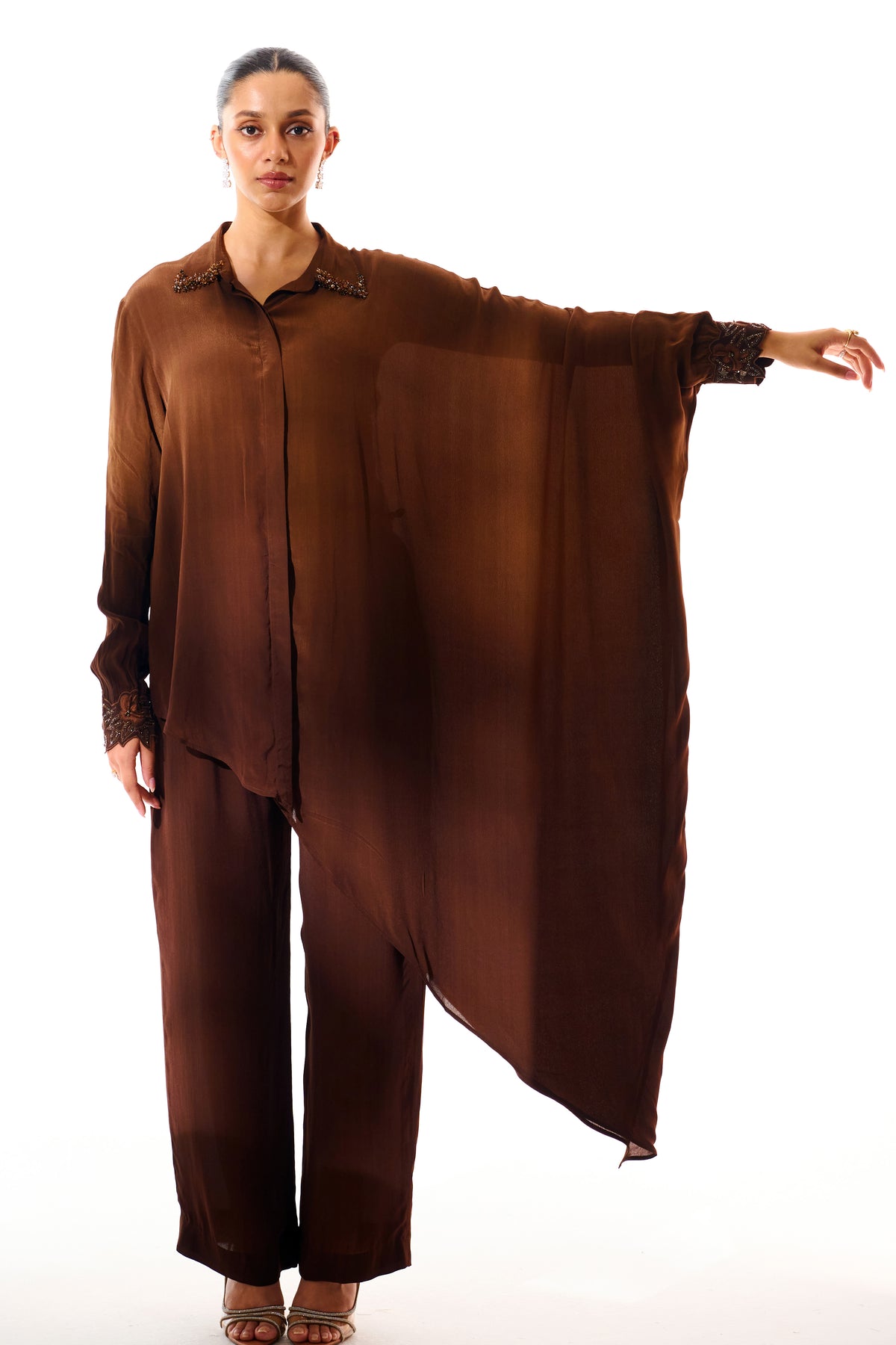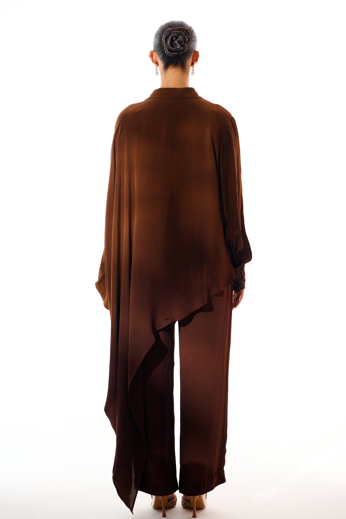 Asymmetric one-sleeve shirt featuring embroidered cutwork cuffs, paired with straight pants. Ideal for fashion-forward occasions