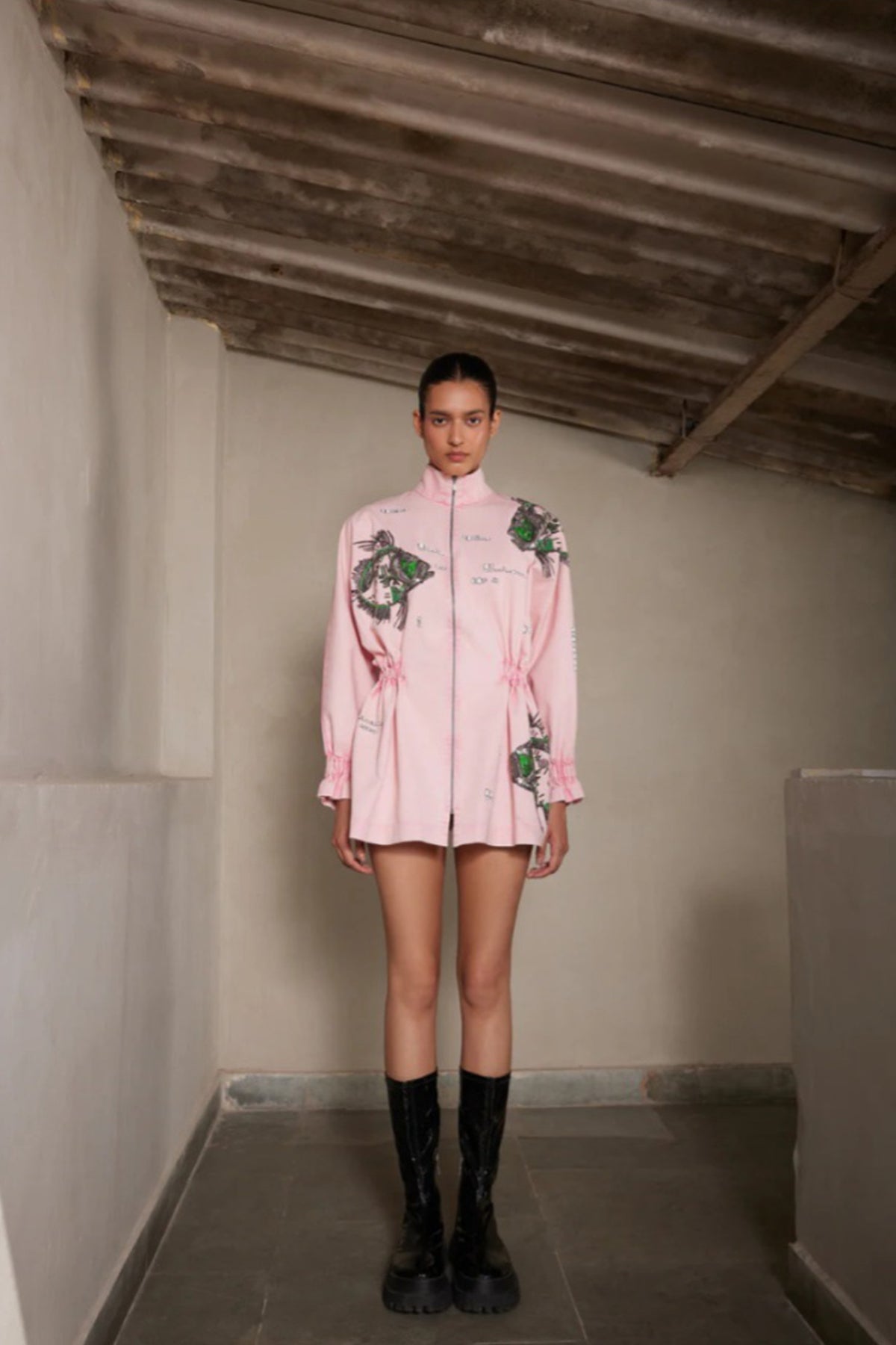 Jacket dress with hand-embroidered Big Fish. It features full sleeves with elasticated cuffs, a partially elasticated waist, and a front metal zip opening.