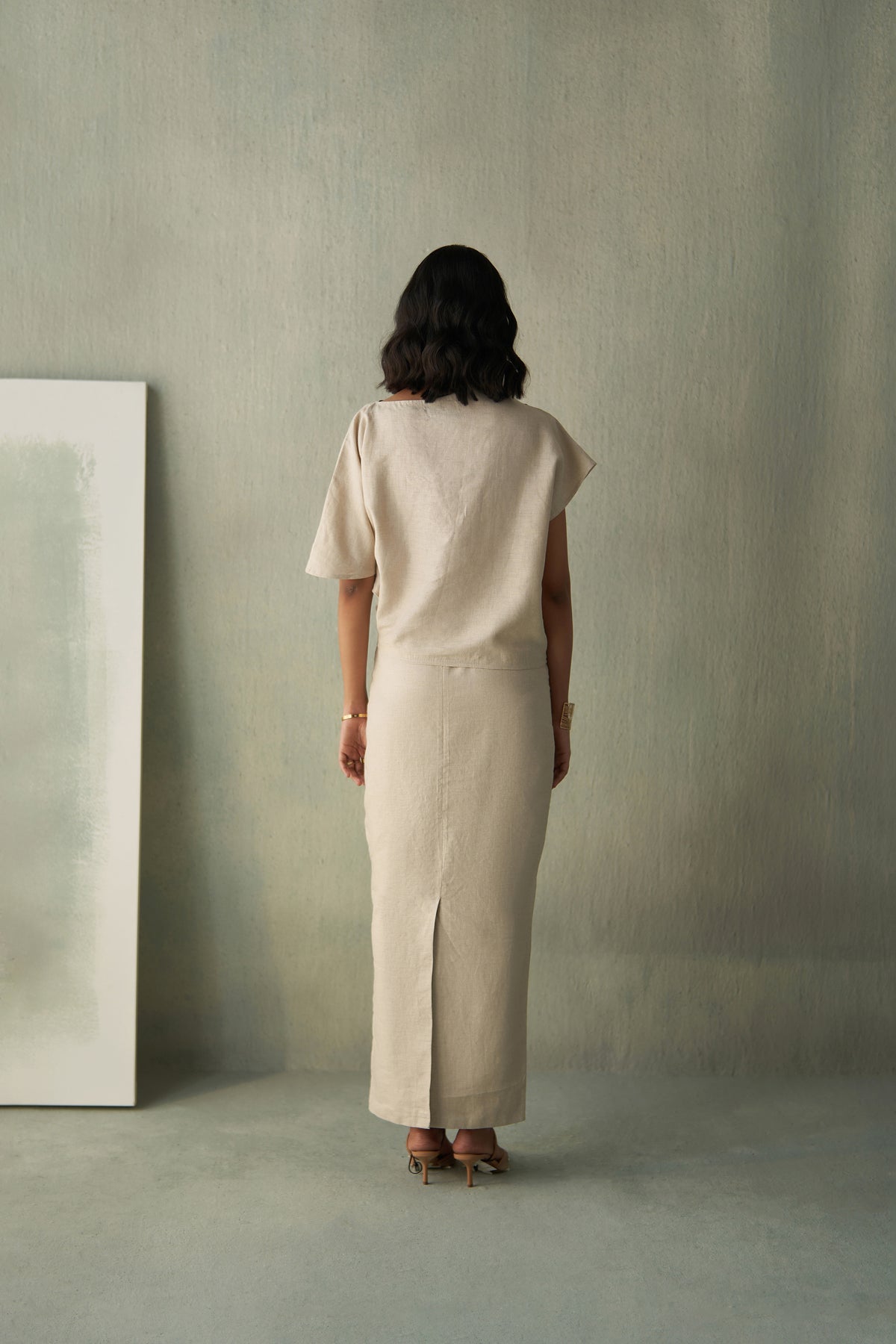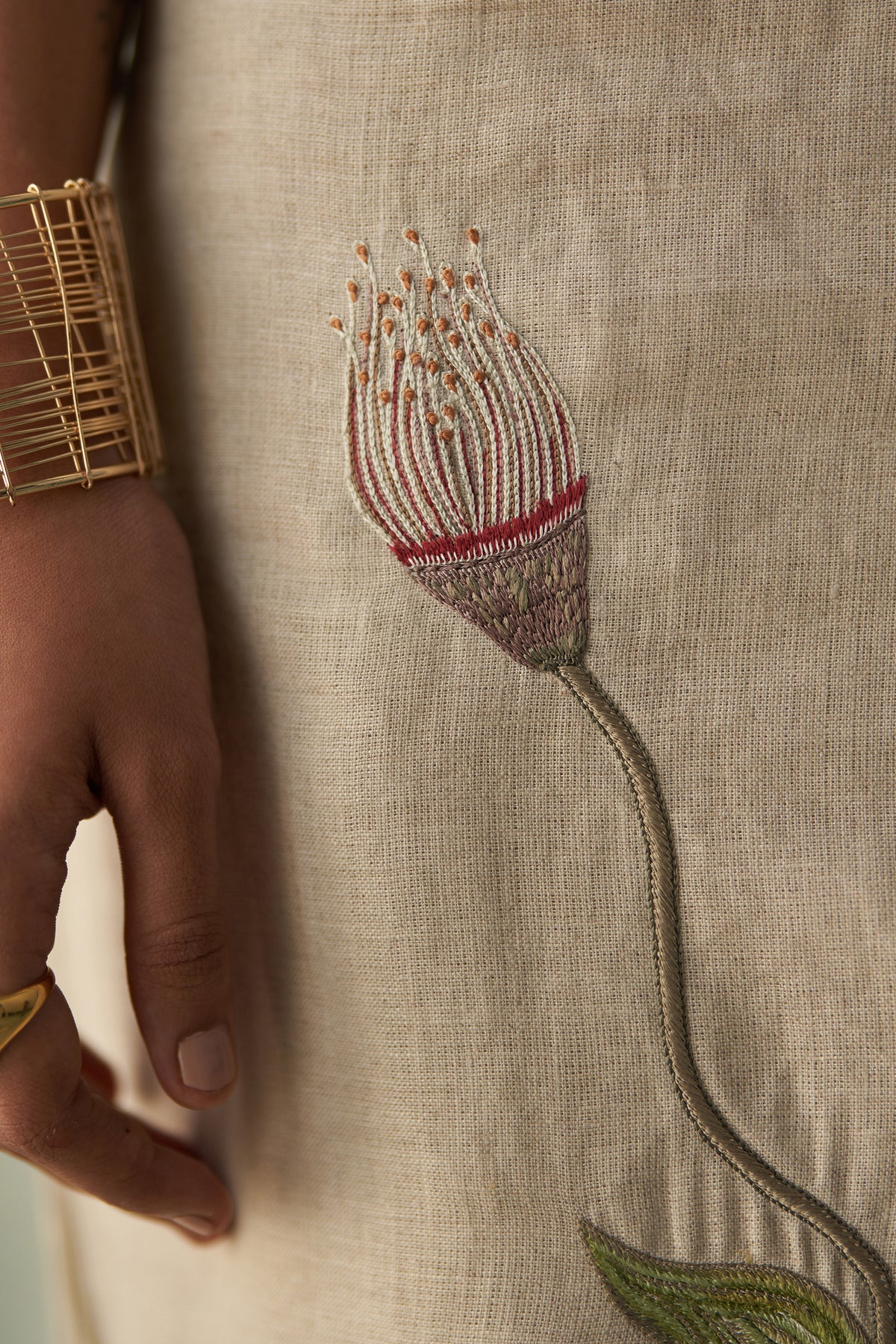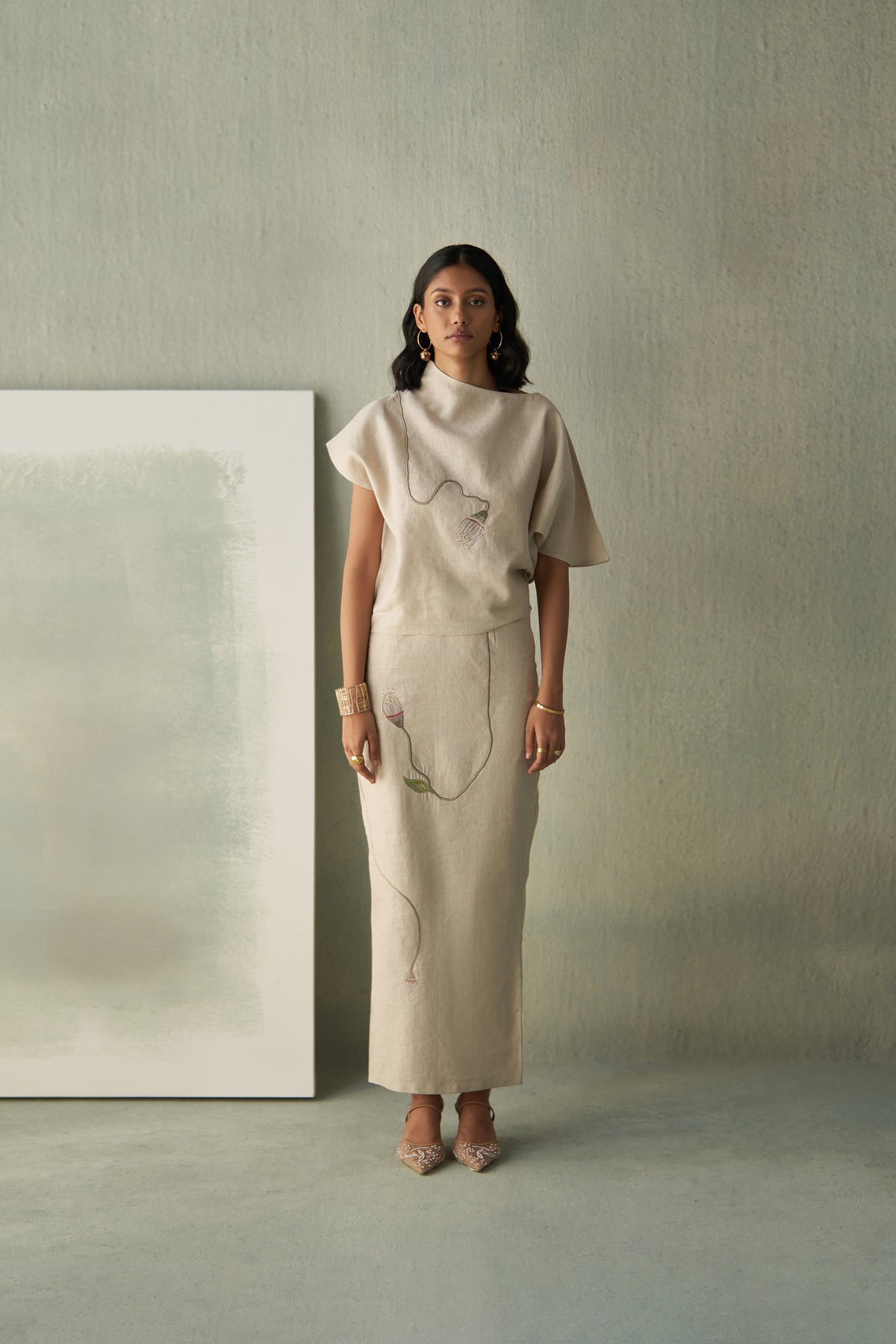 Inspired by the quiet beauty of arid landscapes, this linen co-ord set features a relaxed asymmetric top paired with a straight-fit skirt. The natural beige hue is brought to life with delicate hand embroidery of blooming pods in soft desert tones. Lightweight yet structured, it embodies effortless sophistication — perfect for understated daytime outings or serene evening wear.