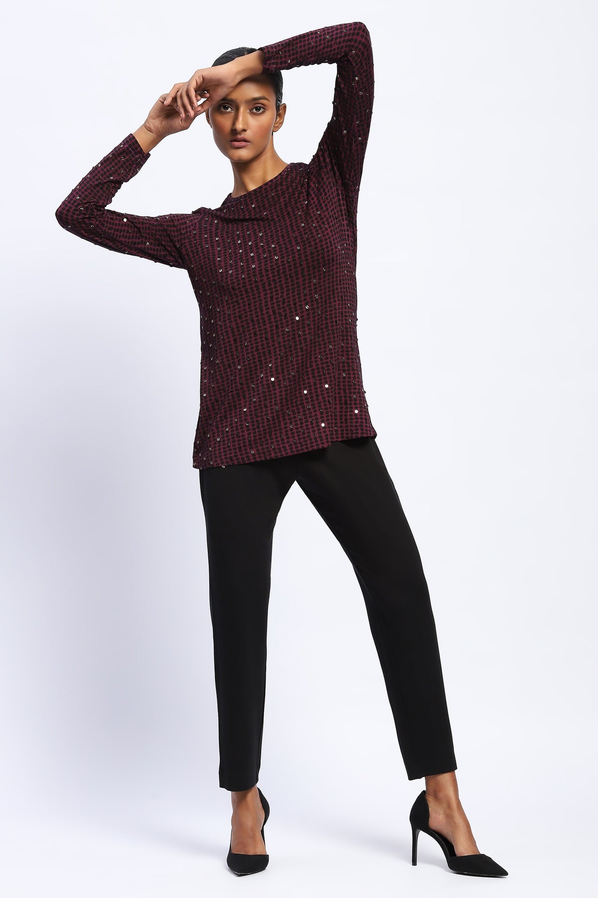 This piece has been made using 100% viscose lycra knit with an all over dot print and stone embellishment.