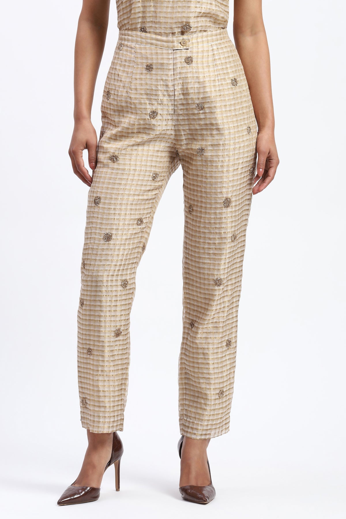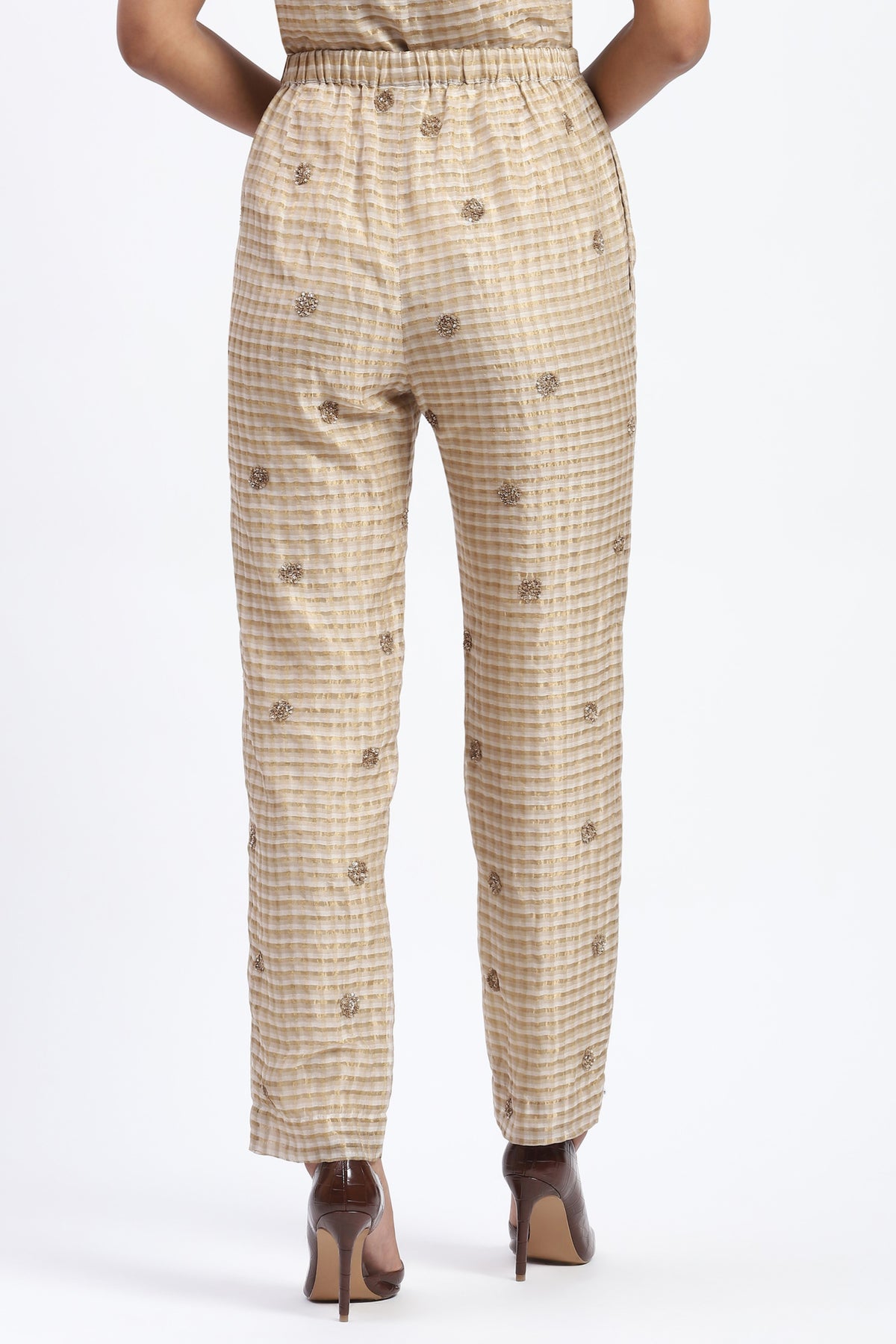 This limited edition piece has been made using a specially woven silk x cotton fabric with metallic gold thread and embellished with hand done sequined dots for evening glamour.