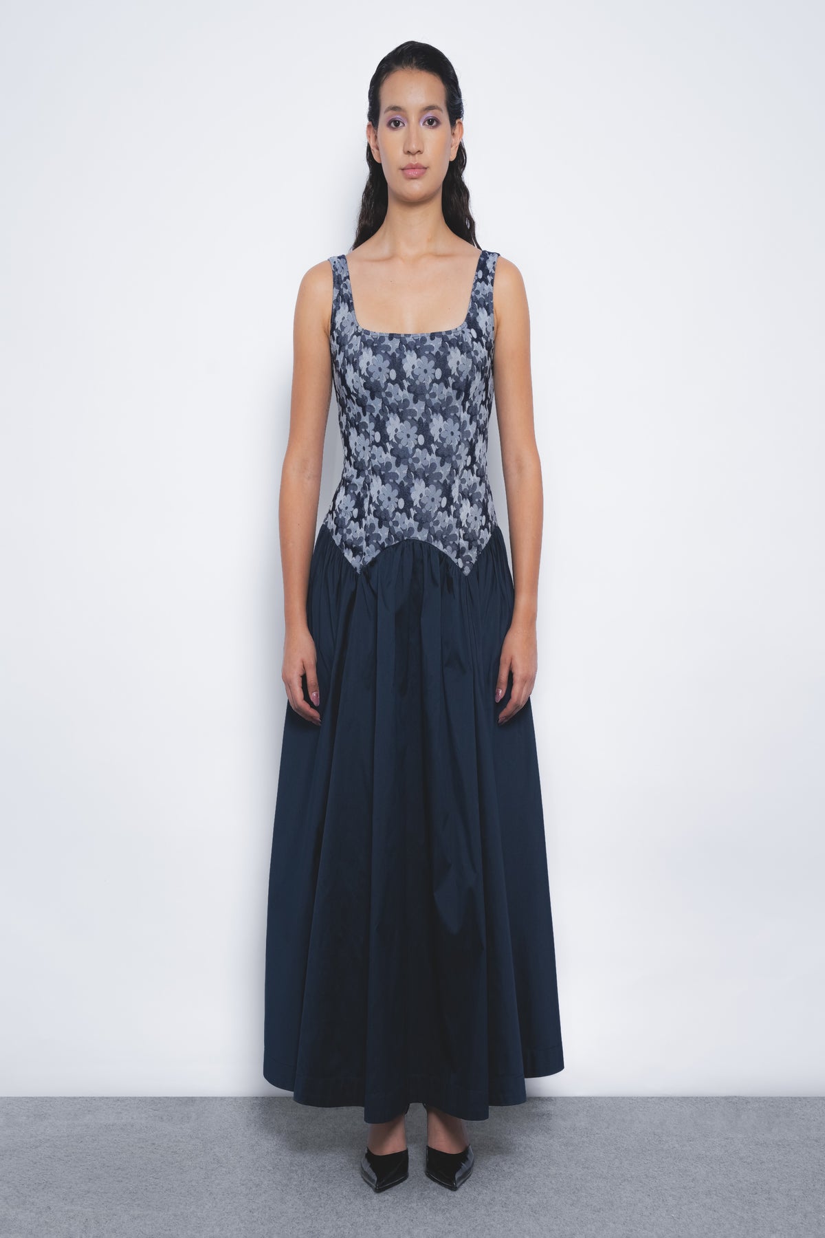 This garment merges a sharp, tailored cut with feminine, sensual details, seamlessly enhanced by lace accents layered over lustrous taffeta.