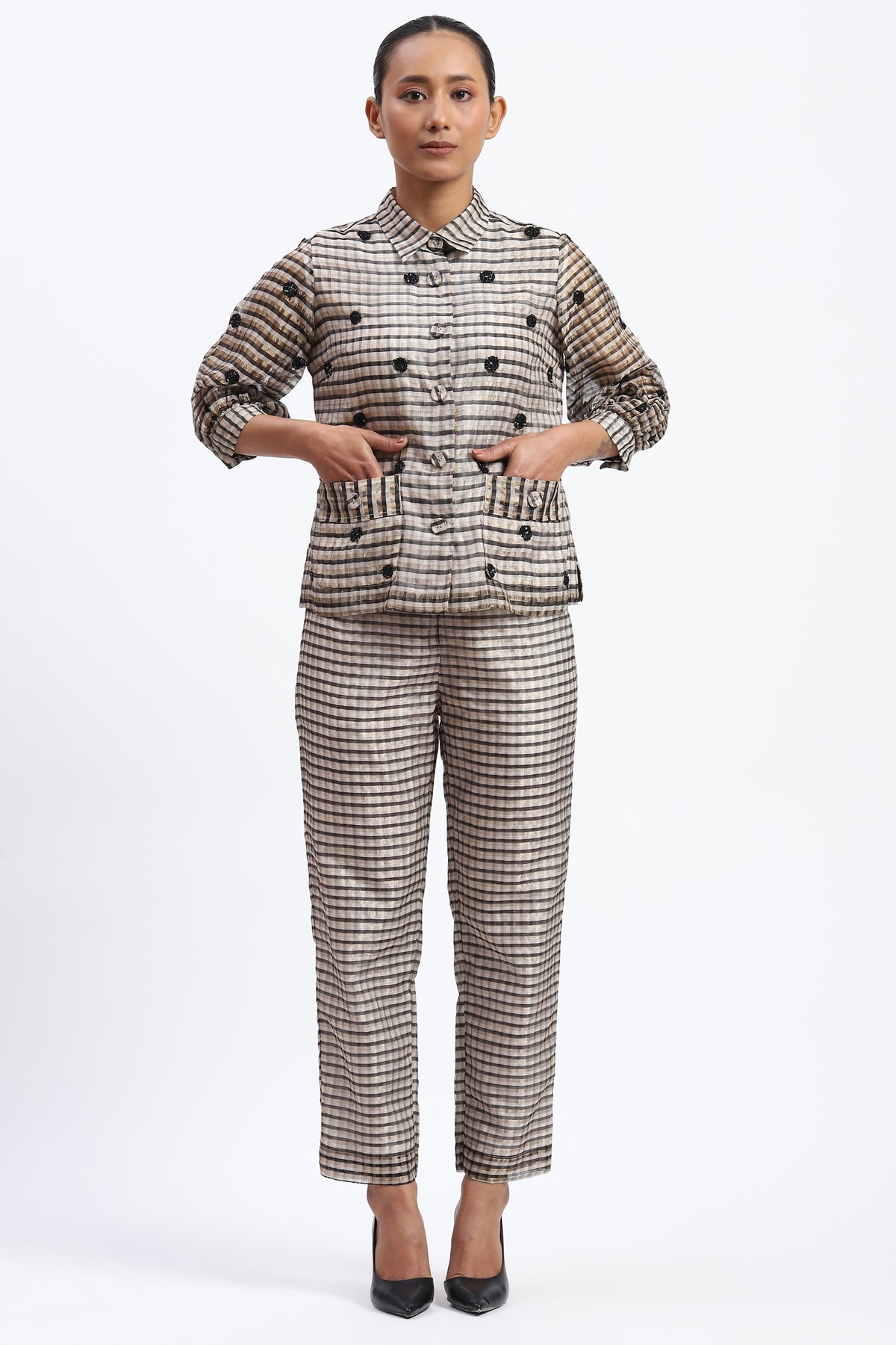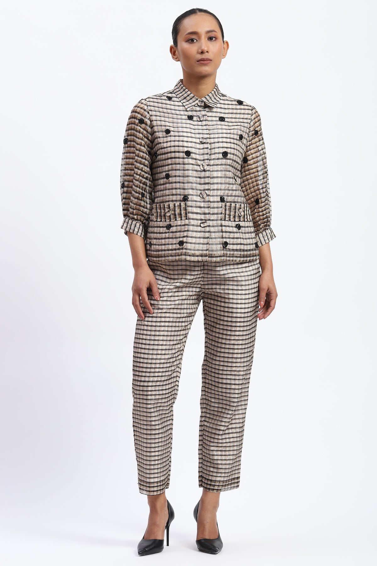 This limited edition piece has been made using a specially woven silk x cotton fabric with metallic gold thread and embellished with hand done sequined dots for evening glamour.