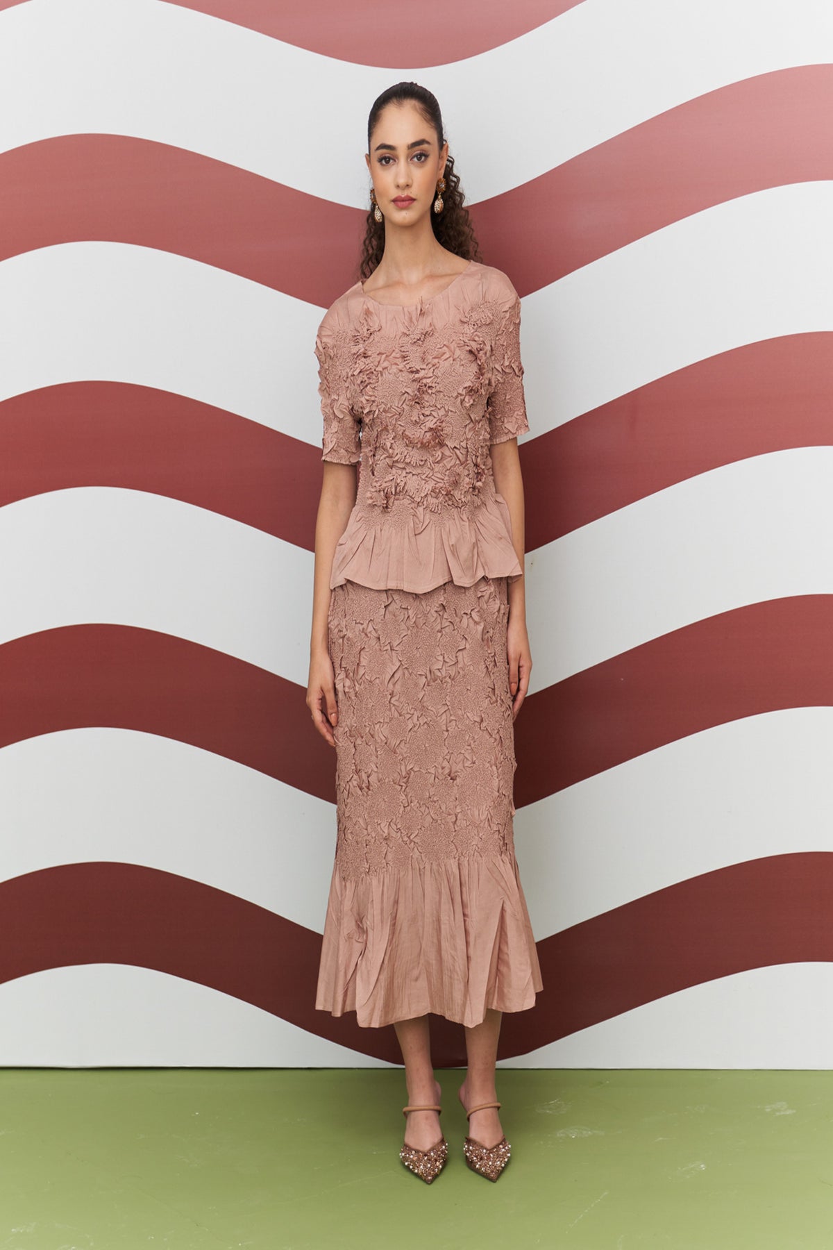 Featuring a peach crinkle top with ruffle detailing in polyester base. It is paired with matching color crinkled skirt.
