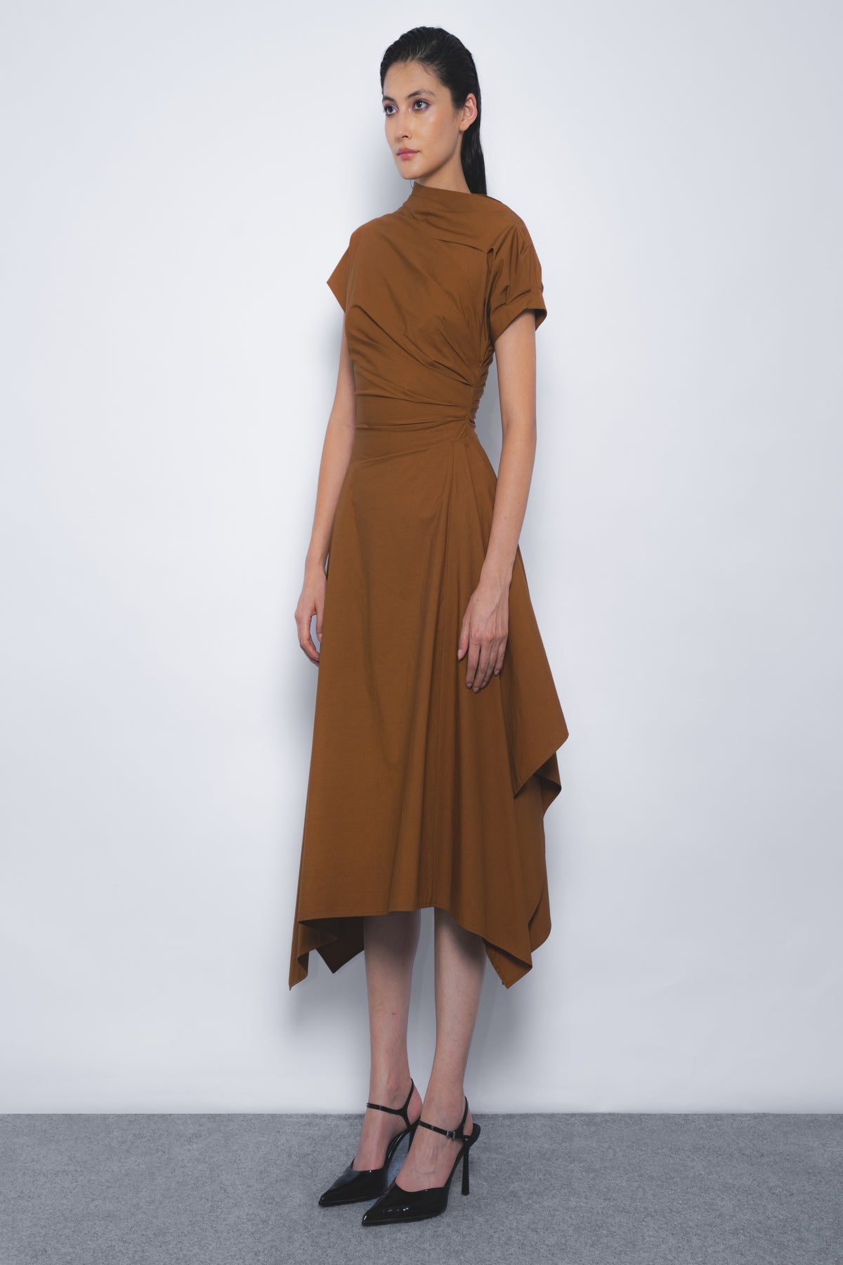 This asymmetrical silhouette experiments with symmetry and fabric manipulation, draped to contour the torso and accented with side pleats. A contemporary cocktail dress, its edgy hemline fuses elegant draping with an angular, asymmetric form.