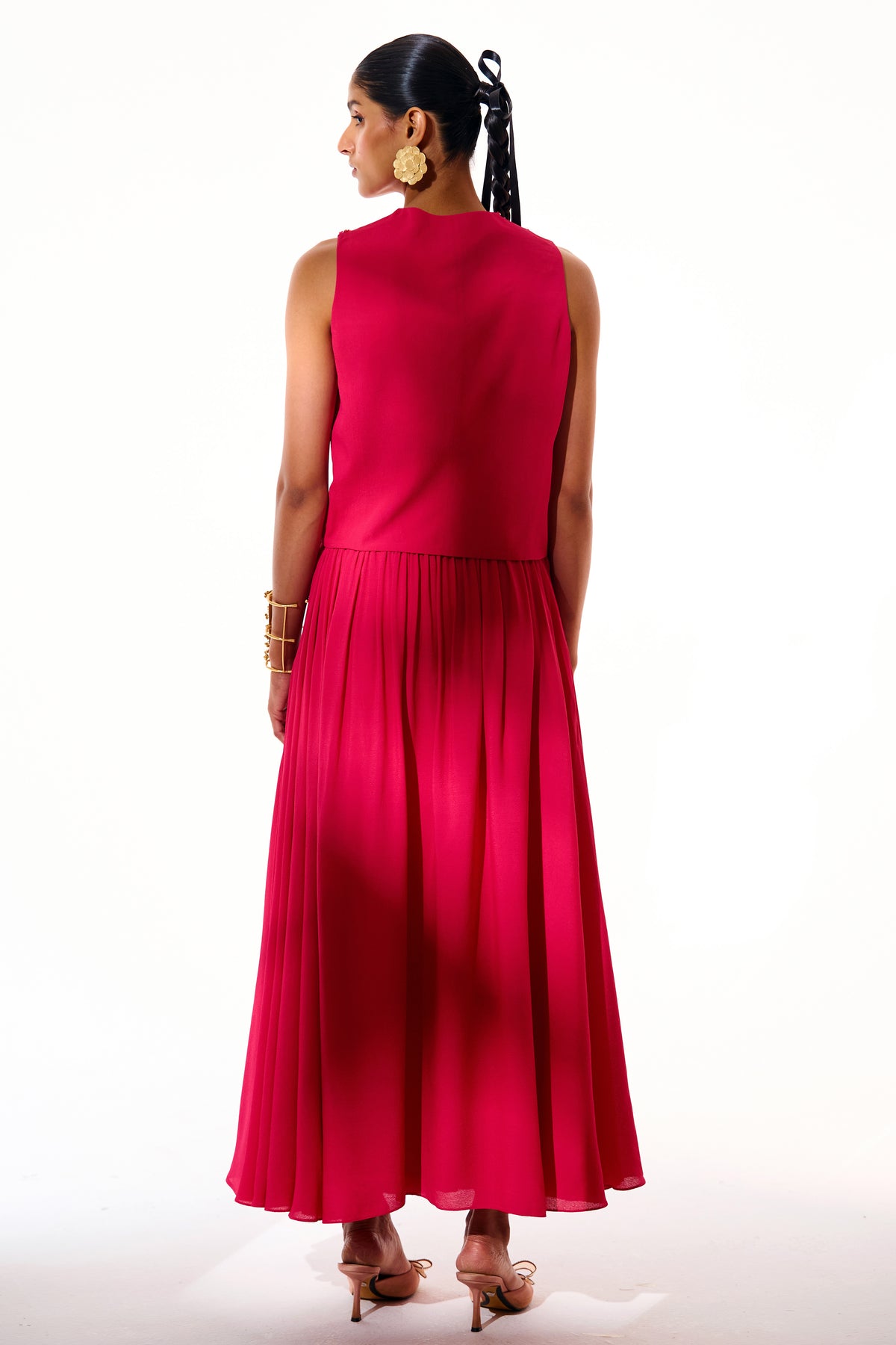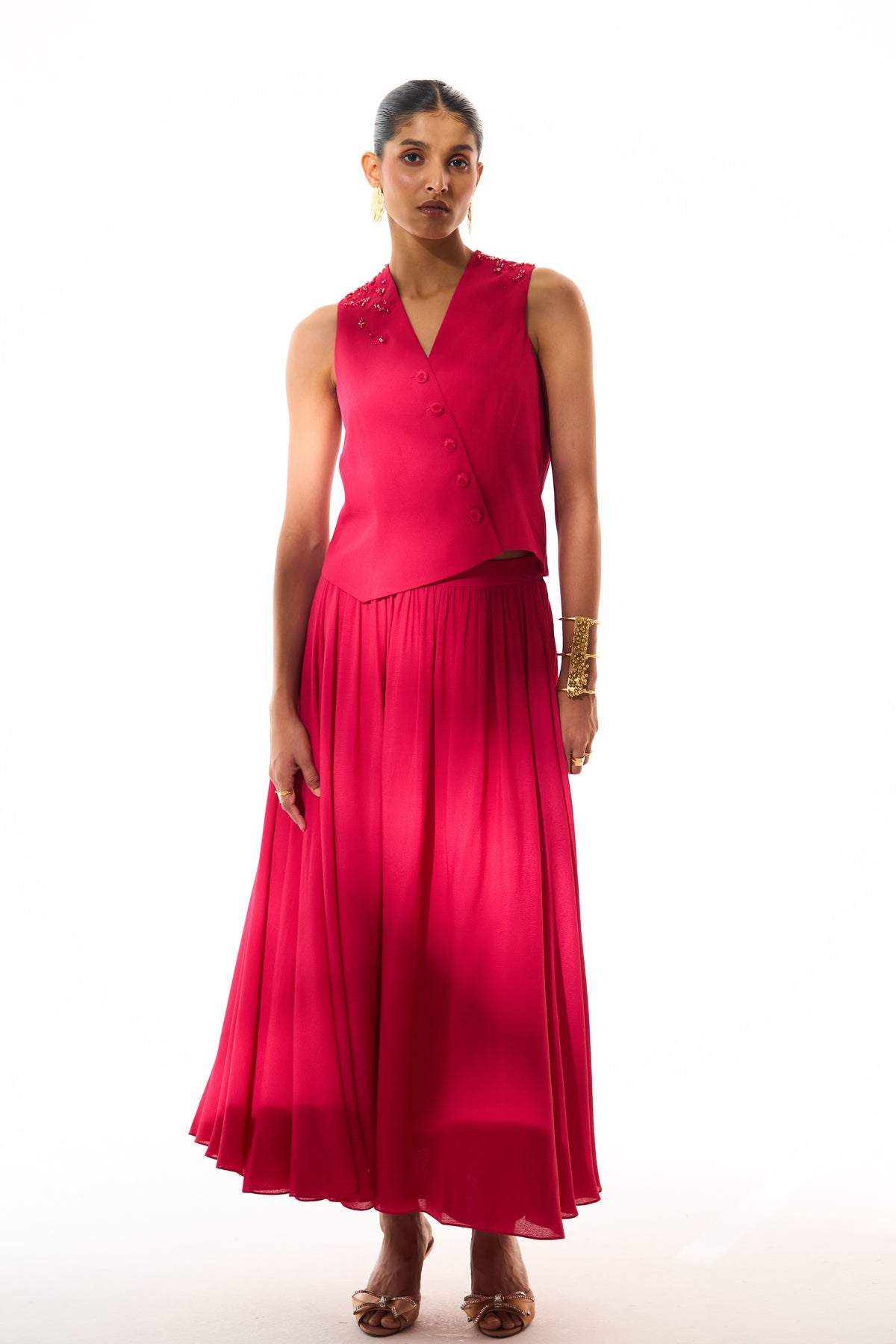 Embroidered sleeveless blazer with slant hand made button detailing at front paired with full circle skirt with pockets, this ensemble blends structure with elegance.