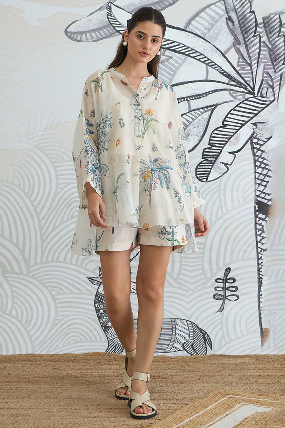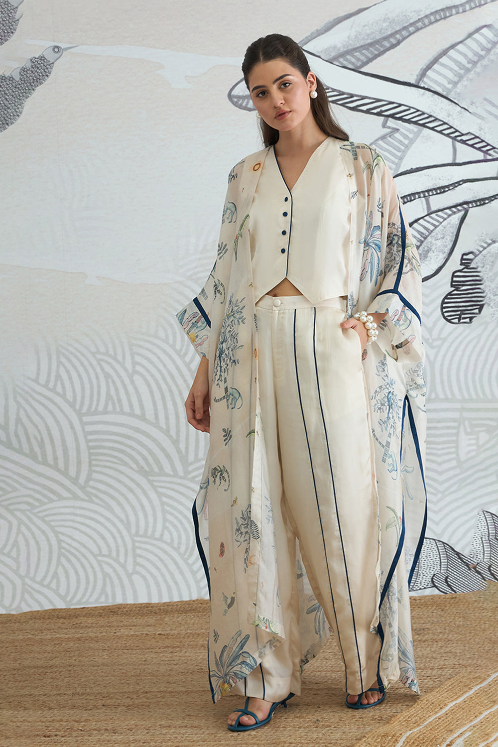 Beige Check Flower Kimono Tunic With Plain PantsTS
